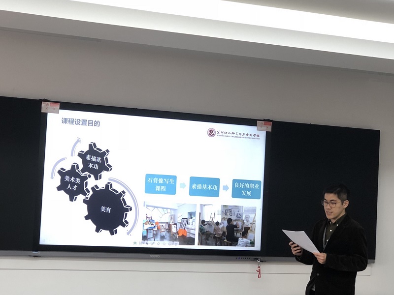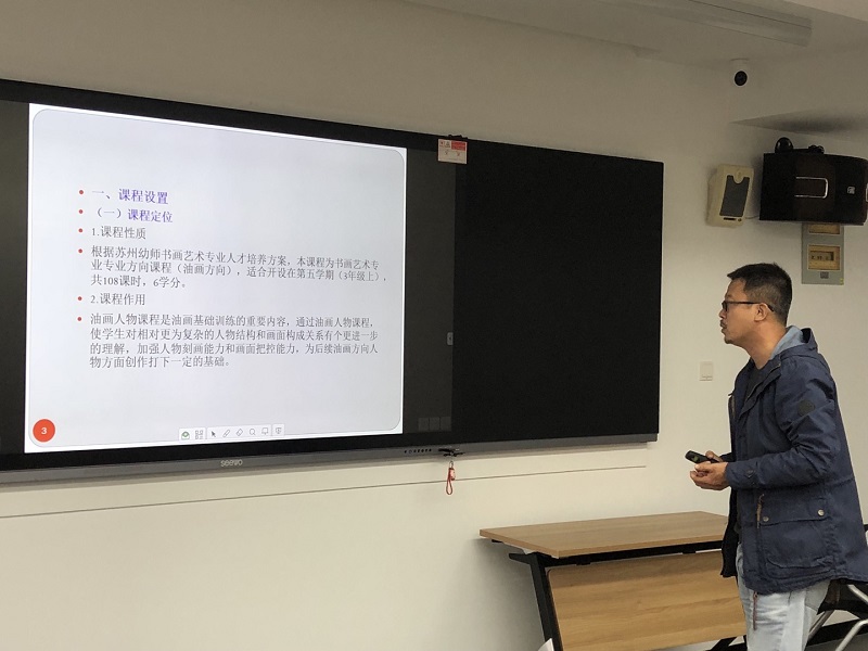 2021年11月19日周五下午,艺术系美术专业教师在实训楼进行了最后一轮说课程说课标的模拟演练。艺术系王王婉青老师全程参与,并与每个教师予以交流和点评。美术教研室所有教师都到场参与。
