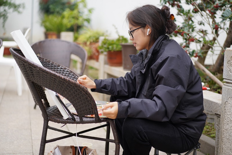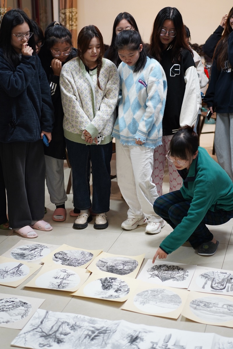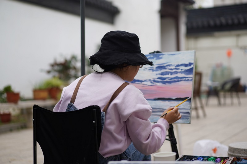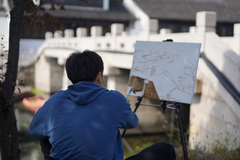 虽已是深秋时节,但阳光依旧明媚动人,洒在人身上暖暖的。同学们走过长长的青石桥、石板路,在悠悠古巷感受江南之秋的静美。青砖黛瓦马头墙,回廊挂落花格窗,在这古色古香的宁静小镇,同学们寻一处坐,铺开画纸,艺术的灵感在此刻迸发而出,枯藤老树、流水人家、古寺铜钟、落日余晖......一处处绝美的景皆入画中。