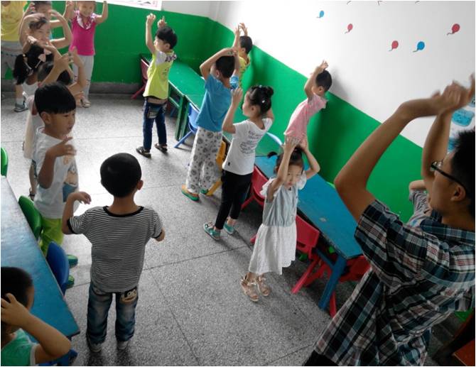 “上课时,小朋友的注意力很不容易集中,需要不断提醒。有一些小口令是比较有用的,比如说:小嘴巴闭闭紧; 小眼睛看老师等等。此外,还要表扬多批评少。表扬做得好的那个小朋友,他就会很有自豪感,也会更听你的话,别的小朋友也会模仿他做好。上课时,更多的是他们自己想象,自己讲。如上一节《认识水果》的课,可以先问他们:“老师可喜欢吃水果啦,你们喜欢吗?”“喜欢。”“你们喜欢什么水果呀?”“苹果。”“香蕉。”“那你能告诉我它们是什么颜色的吗?”“苹果是红色,香蕉是黄色。”让他们思考,遨游在想象的海洋。