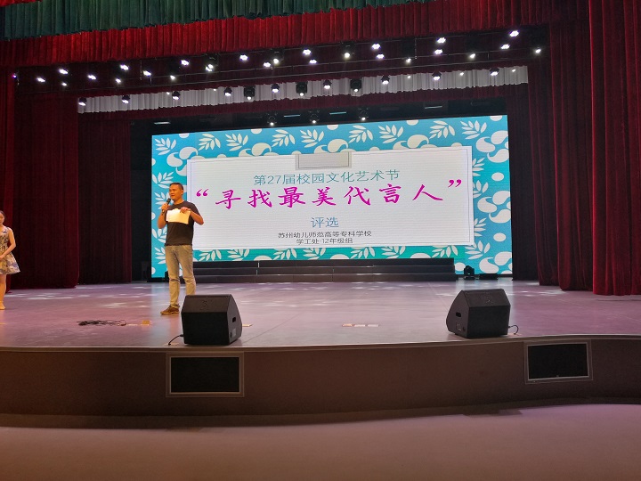 苏州幼师第27届校园文化艺术节在青春洋溢的5月拉开了序幕。5月16日下午,在演出厅举行了本次艺术节中的一项活动——“寻找最美代言人”的评选活动。来自12级的9位同学代表班级,展示了各自的风采。部分校领导,12级班主任和专业课老师出席了活动。