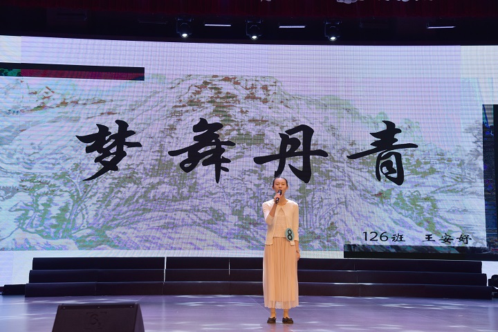 126班的王安妤对中国画情有独钟,她演讲的主题是《梦舞丹青》。她阐述了自己对于“最美代言人”的理解:既要全面发展,也要有自己的特长和内在修养。王安妤在现场展示了她的原创作品——《脐石》。这幅画将近八尺 ,是她去黄山写生,获得灵感,构思创作而成的。她对绘画的热爱,对艺术的不懈追求令人动容。