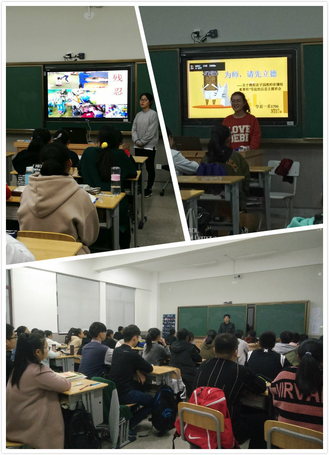 2017年11月13日,学前1系所有班级围绕“携程亲子园教师涉嫌殴童”事件开展一次关于师德教育的主题班会,对于近日的热点话题“虐童”进行了深刻的剖析,提高我系学生的师德意识。