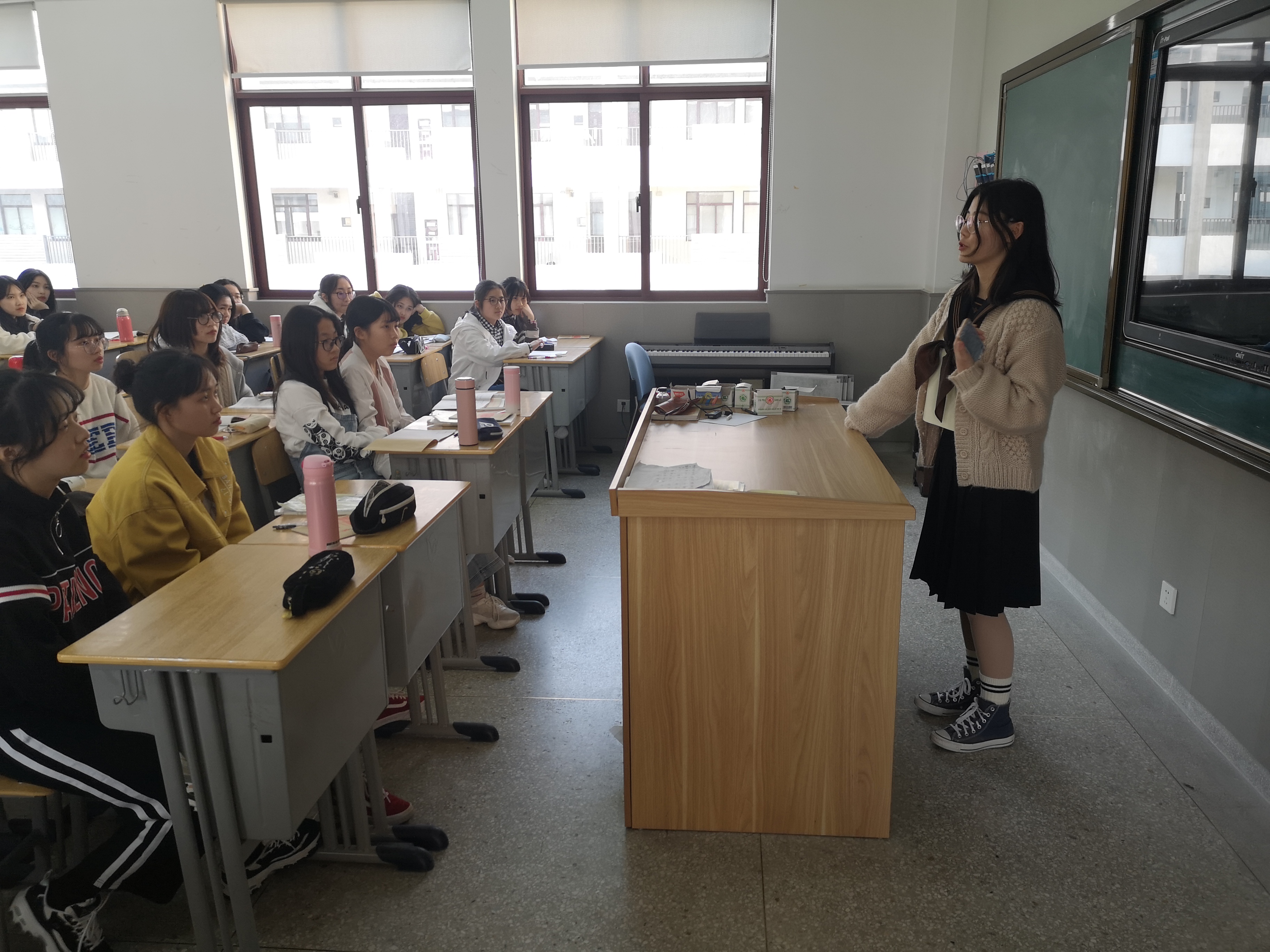 接着是148班同样优秀的顾心怡学姐,她在常熟考编中获得了小组第一名的好成绩。顾学姐主要给大家分享了自己考编的经历和经验。考编分为笔试和面试,笔试部分她向大家介绍了所需书目、内容分布、复习计划、考前准备和推荐的辅助工具;面试部分她详细介绍了美术、弹唱、微课和问答四个环节(各地面试流程有偏差),让大家对考编有了全方位的深刻了解。
