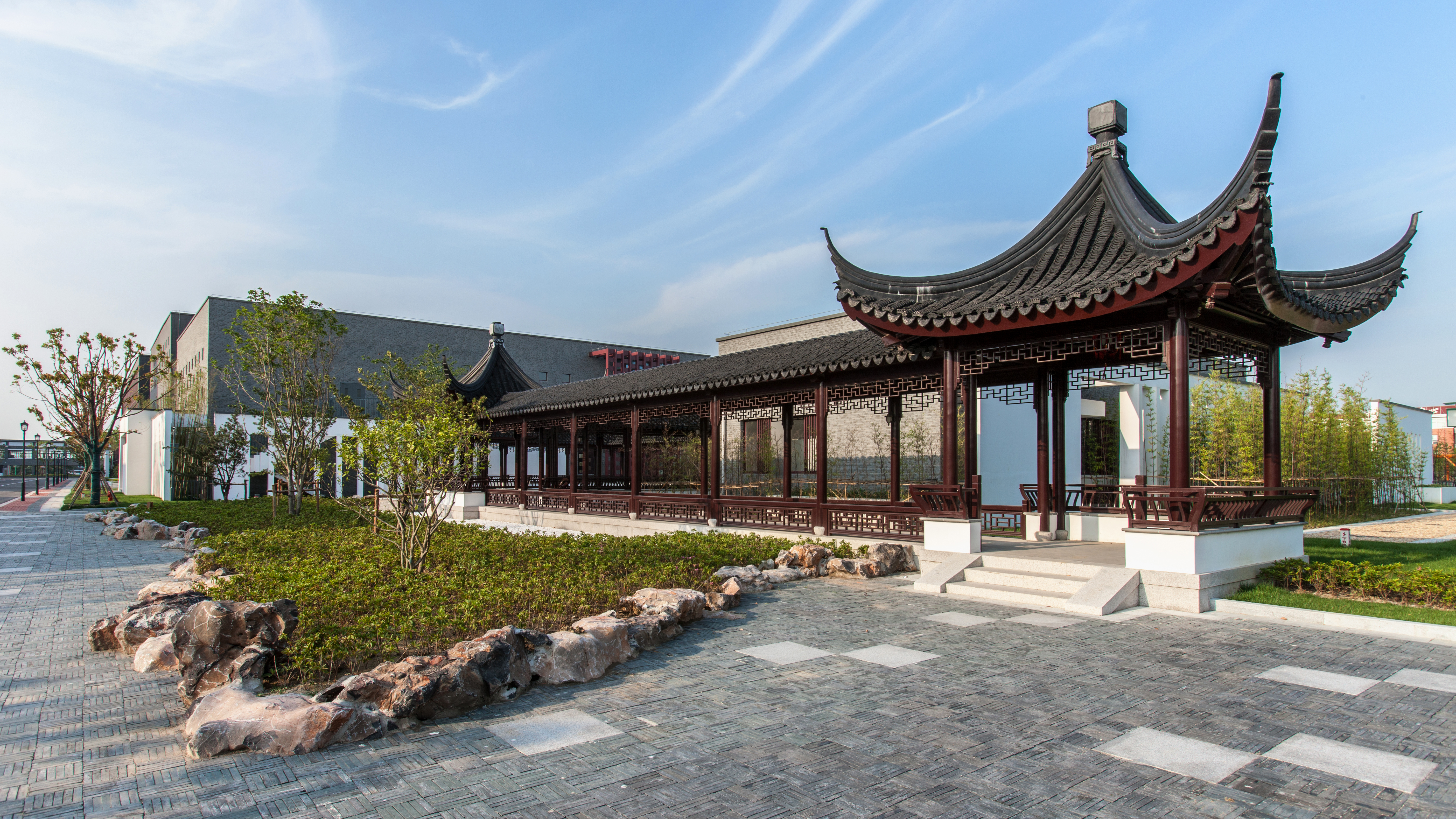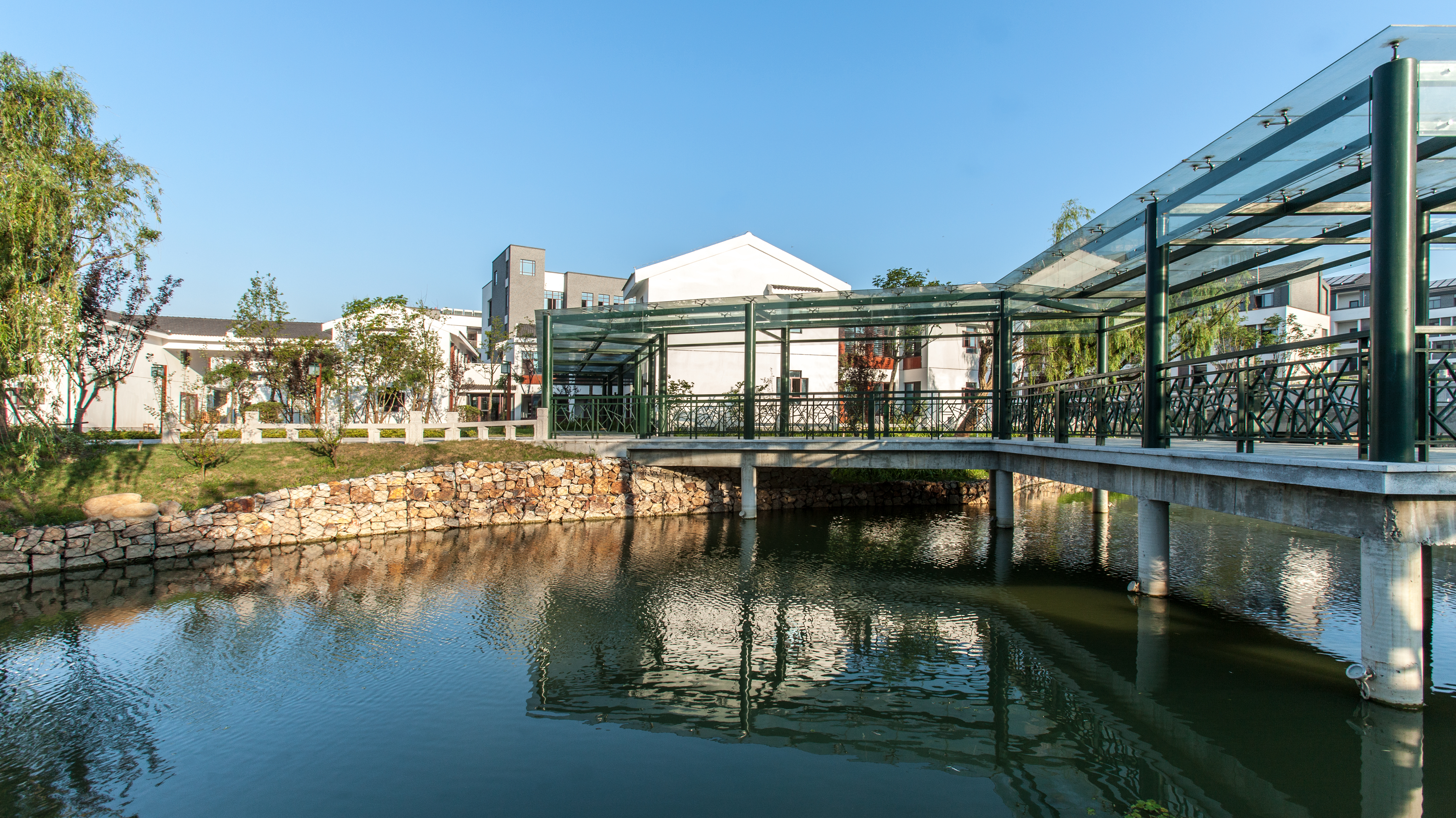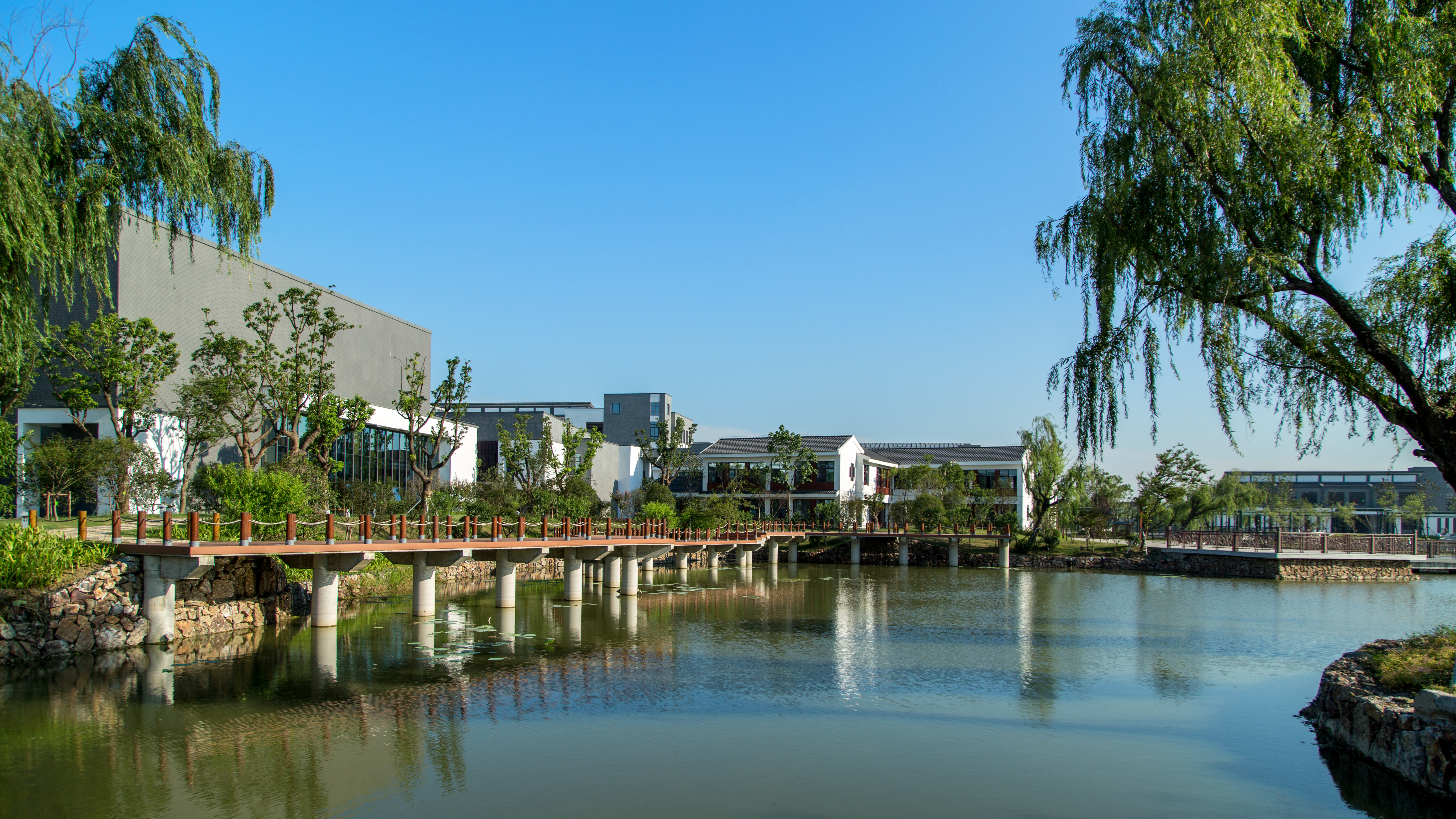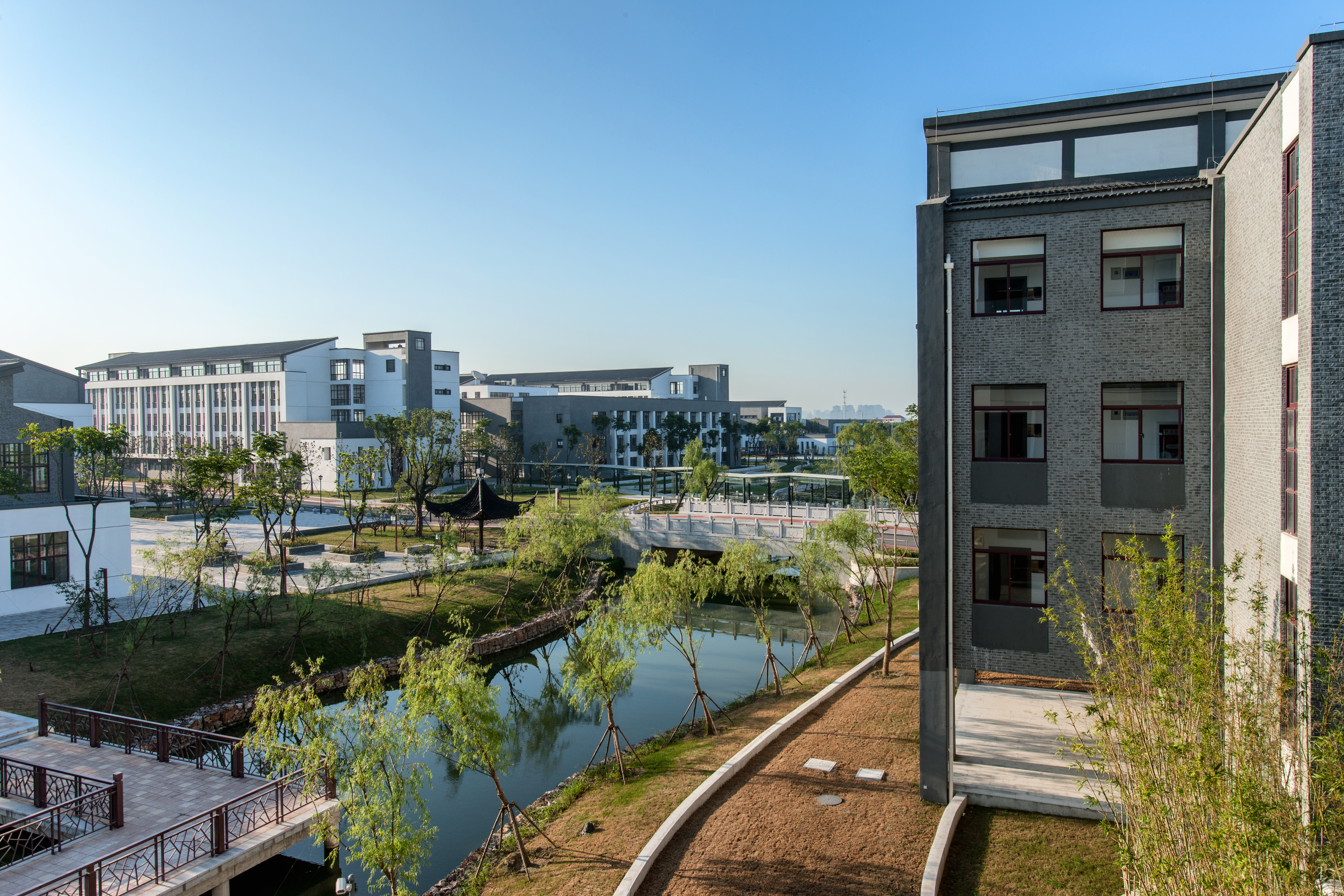 “问许”取自朱熹《观书有感》(其一)“问渠哪得清如许?为有源头活水来。”以“浒”替“许”,有纪念浒关校址意。校园小河命名“问浒”,寄意学校办学不忘历史传承,师生教学善取源头活水,力求事物本源。