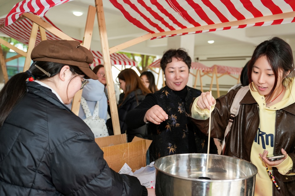 活动现场,就像一个沉浸式的“快乐工坊”。八个各具特色的摊位依次排开,非遗糖画与DIY发簪让传统技艺在年轻人的手中焕发生机,手工棉花糖与石膏娃娃手作唤起纯真童趣,投壶游戏与套圈游戏带来欢声笑语,“烦恼丢丢丢”游戏则为情绪疏导提供了轻松出口。现场还贴心设置了视力检查摊位,提示每个人都要真正成为“自己身心健康的第一责任人”。一件件充满童趣的作品,一次次真诚温暖的交流,如同爱的春风细雨,悄然滋润着师生们的心田,也照亮了每个人心里的那片天空。师生们在创作中释放压力,在游戏中体验快乐,在互动中增进情谊,在分享中传递温暖。
