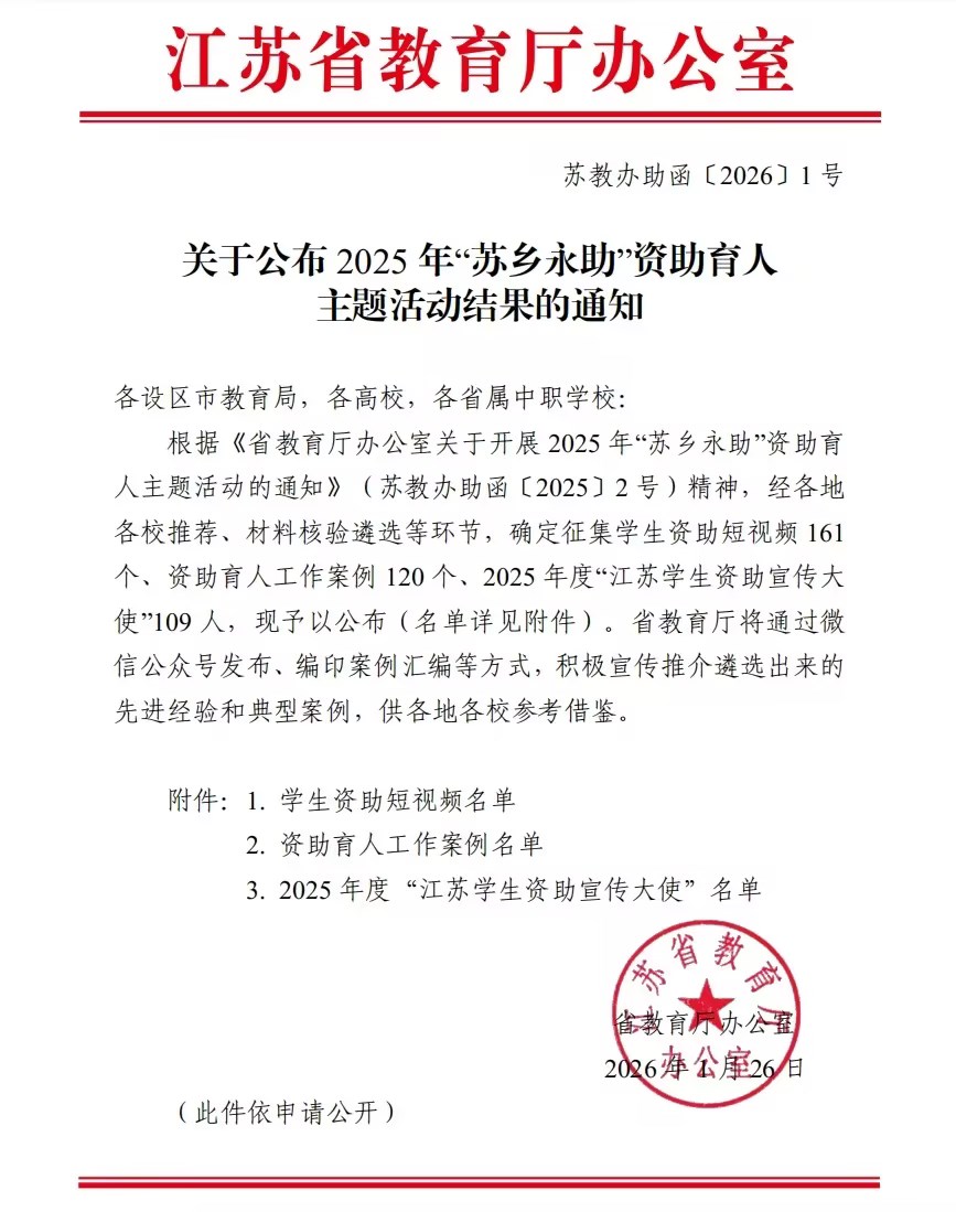 近日,江苏省教育厅公布了2025年“苏乡永助”资助育人主题活动评选结果。经学校推荐、专家评审、结果公示,我校学生资助管理中心报送的工作案例《融制度组织项目之力,绽助困育人润心之光——以志愿服务为载体构建“发展型”资助育人新模式》获评“江苏省资助育人工作案例”。