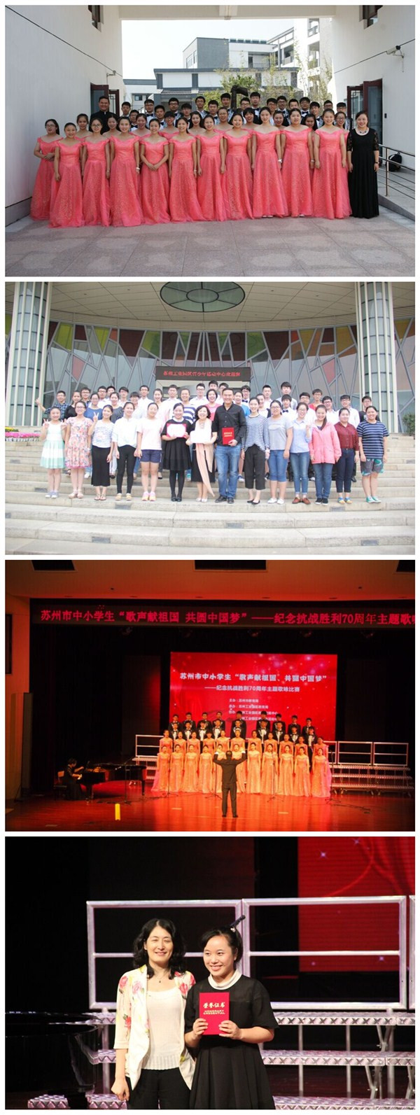 2015年9月24日,我校声乐特长班的四十名同学在王锋老师和刘珈老师的带领下来到苏州工业园区青少年活动中心参加苏州市中小学“歌声献祖国,共圆中国梦”——纪念抗战胜利七十周年主题歌咏比赛。