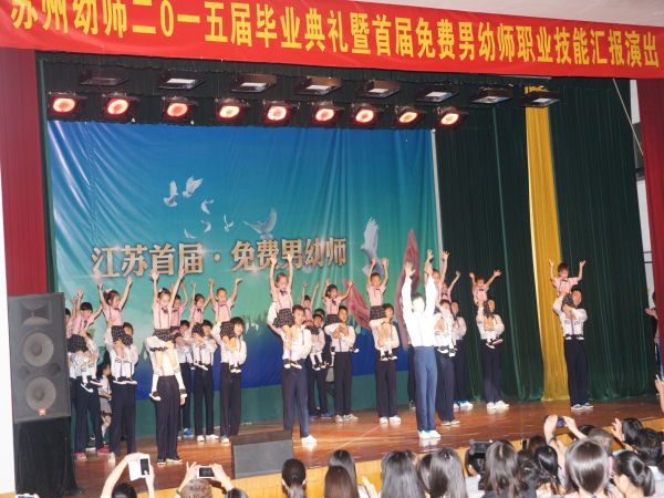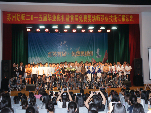 2015年6月27日上午,苏州高等幼儿师范学校首届免费男幼师生毕业汇报演出在学校虎丘校区演出厅如期进行,来自全省各地的100名首届免费男幼师生展示了他们五年来在苏州幼师的学习与成长,“我骄傲,我是男幼师”主题毕业汇报演出传达了男幼师生的自信和追求。