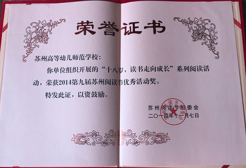 在苏州市阅读节组委会举办的第九届苏州市阅读节评比活动中,我校由潘伟斌老师组织策划的系列读书活动“十八岁,读书走向成长”获优秀活动奖。