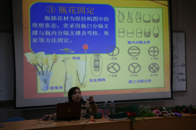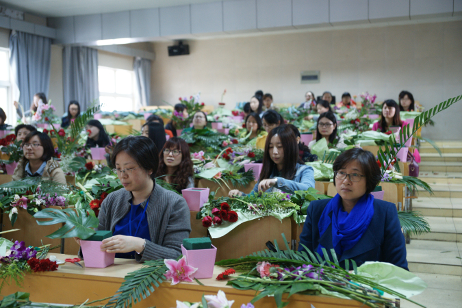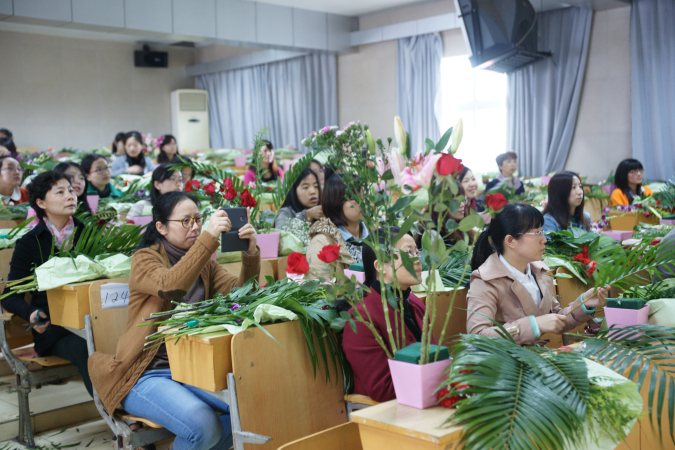 2015年4月3日下午,我校邀请苏州农业职业技术学院田松青副教授在东校区阶梯教室给全体女教职工上了一节插花技艺课。田松青老师曾被选为“花卉园艺工首批国家级试题库的开发建设专家”,被农业部授予“全国农业职业技能开发先进工作者”,她的课生动、形象,受到了大家的热烈欢迎。