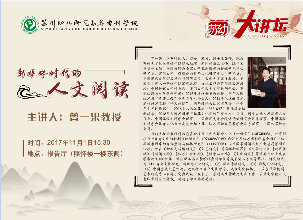 诗意人生,人文苏幼。11月1日下午,苏州大学凤凰传媒学院曾一果教授做客苏幼大讲坛,在校报告厅为同学们带来了《新媒体时代的人文阅读》主题讲座。