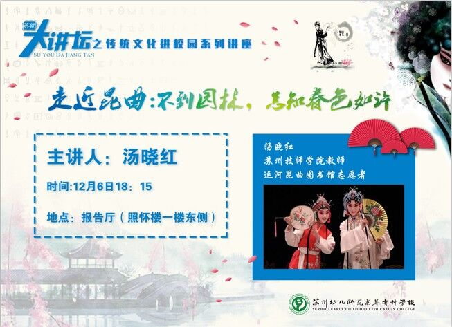 12月6日晚,汤晓红老师做客苏幼大讲坛,在校报告厅为同学们带来《走近昆曲:不到园林,怎知春色如许》主题讲座,带领我校学前二系、艺术系17级学生一起走近昆曲。