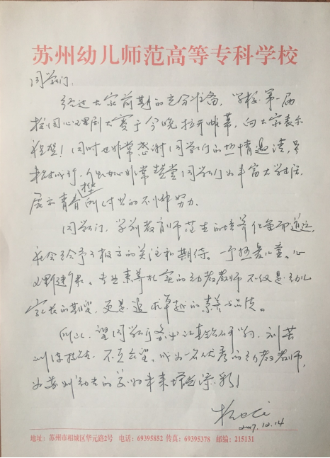 所以,望同学们务必认真钻研学习、刻苦训练技能,不负众望,成为一名优秀的幼教老师,为苏州幼专的美好未来增光添彩!