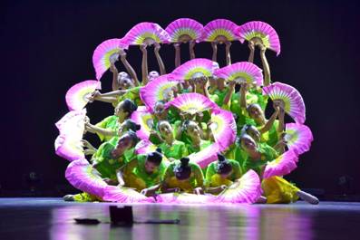 由曹静雯、袁薇老师指导的女子舞蹈团带来群舞《茉莉花》,花开花非花满天,熟练的扇子运用,细腻的芭蕾舞步,配以青黄修长的舞衣,江南情韵丰盈。
