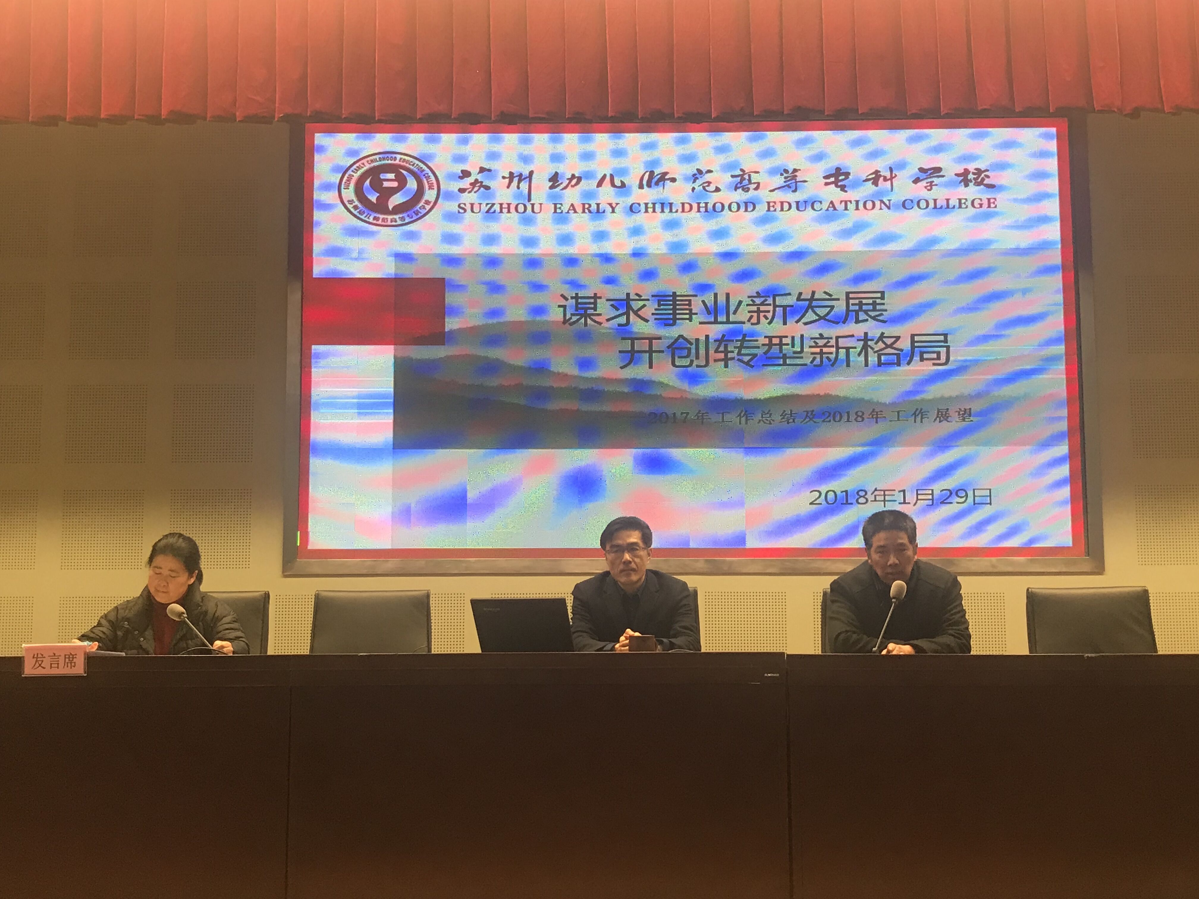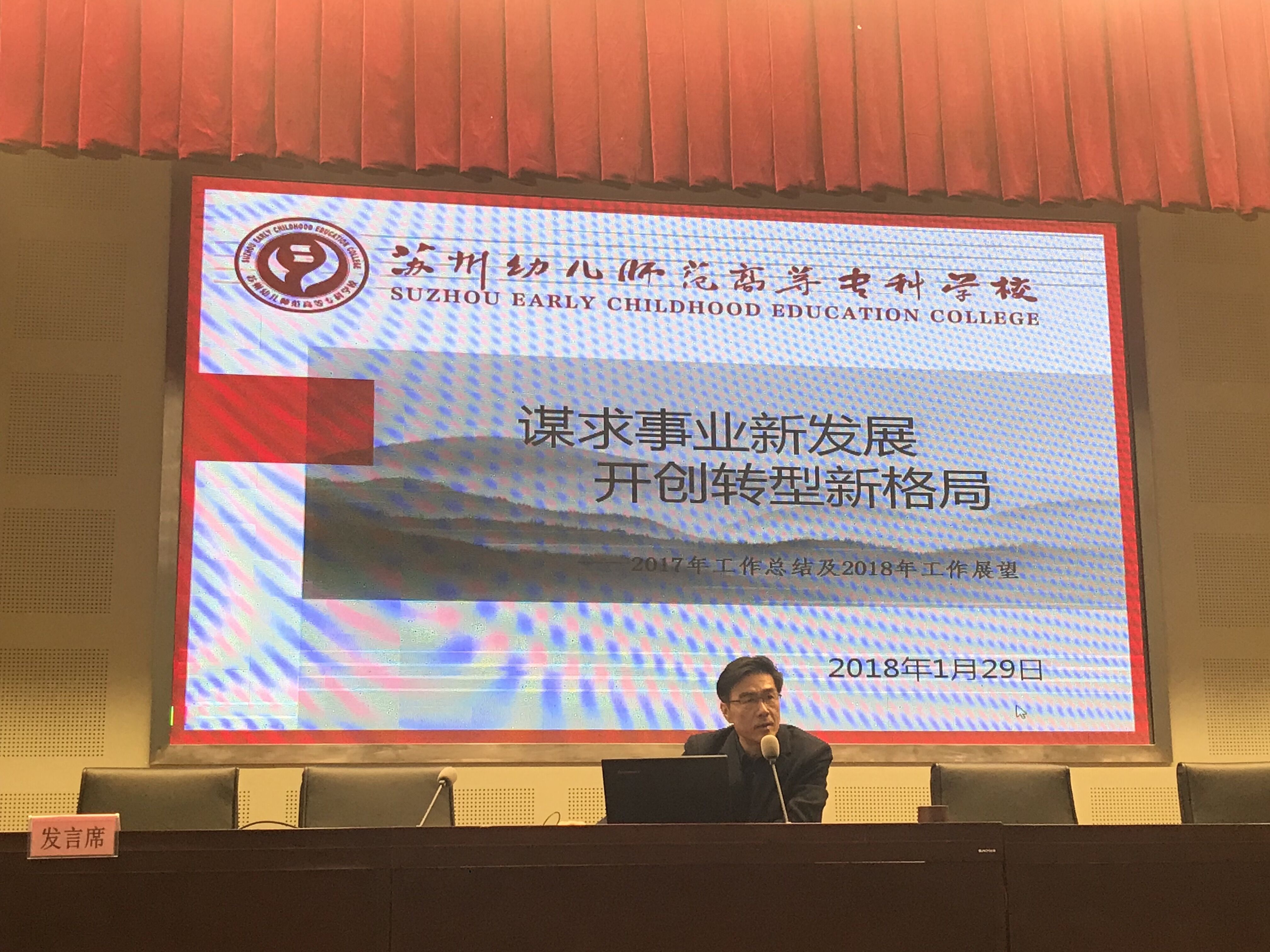 第二项议程是杨建良校长作2017年工作总结及2018年工作计划。杨校长向全校教职工作了题为《谋求事业新发展 开创转型新格局》的报告。