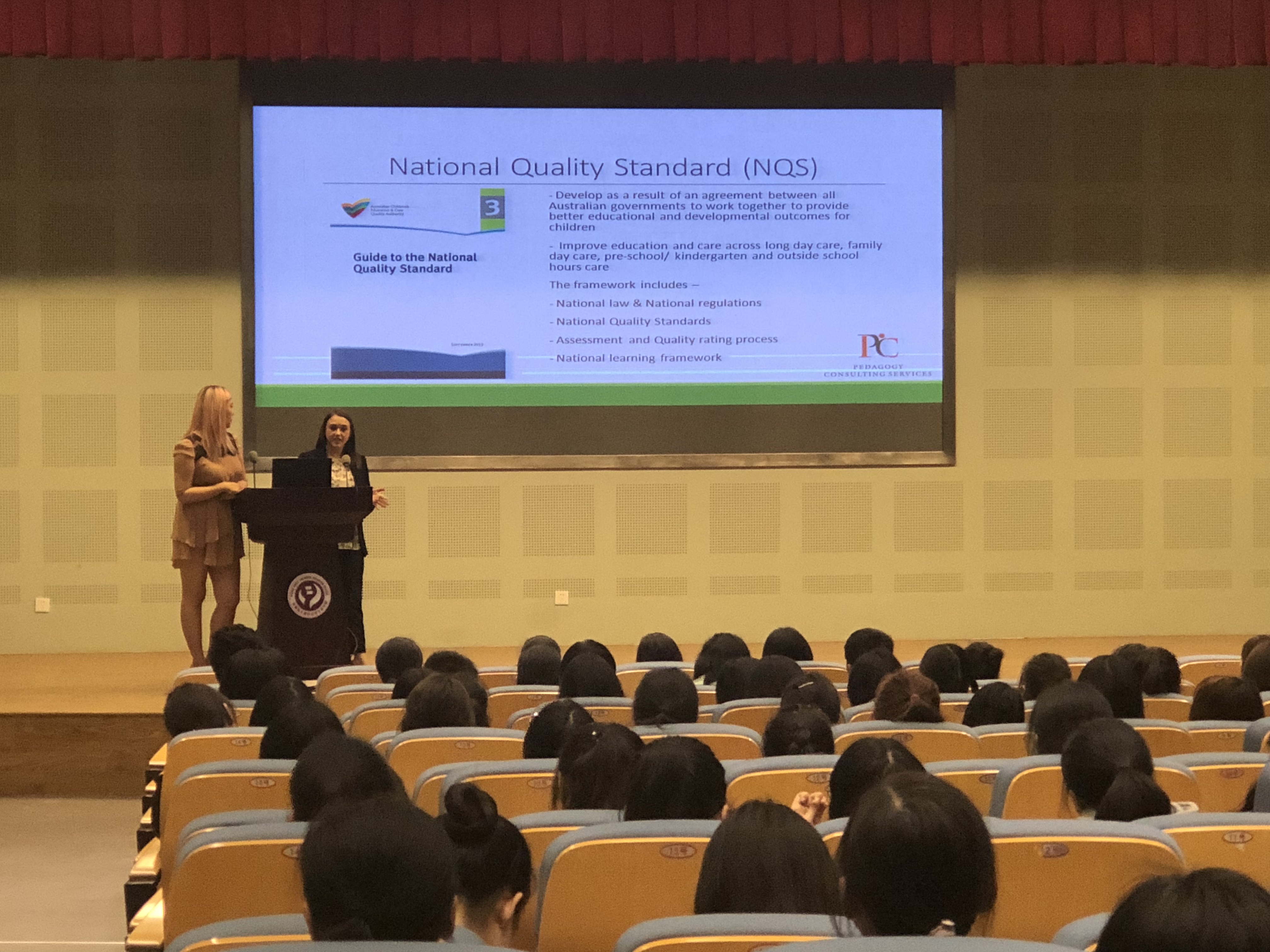 随后两位园长为我校学生带来了两场精彩的学术讲座,讲座《让我们一起成长——幼儿教育工作者可持续职业发展道路规划与发展潜力》直击如何成为一个好的幼教工作者,主讲者通过现场互动和案例分析,与学生一起探讨教师与幼儿的关系,教师的角色,教师的发展。主讲者呼吁大家,教师应该是一个与幼儿共同成长的学习者,是一个具有专业素养的陪伴,一个懂得更多的是“启发”而不是纯粹“教”的专业人士。讲座《走进澳大利亚政府最高标准评级的幼儿教育机构——澳大利亚幼儿教育国家教育质量标准,教学框架及最高标准的日常实践》主要介绍了在澳大利亚一个卓越等级的幼儿教育机构是怎么样的,主讲者主要通过分析澳大利亚幼儿教育国家教育质量标准的条款来跟我们的学生阐述幼儿园等机构如何达标,教师、幼儿、家长、幼儿园、家委会、社区等不同角色在这个标准中的职责。两场讲座受到了学生一致好评,学生表示无论是从幼教专业的角度还是打开国际视野的需求,这样的活动对他们来说受益匪浅。