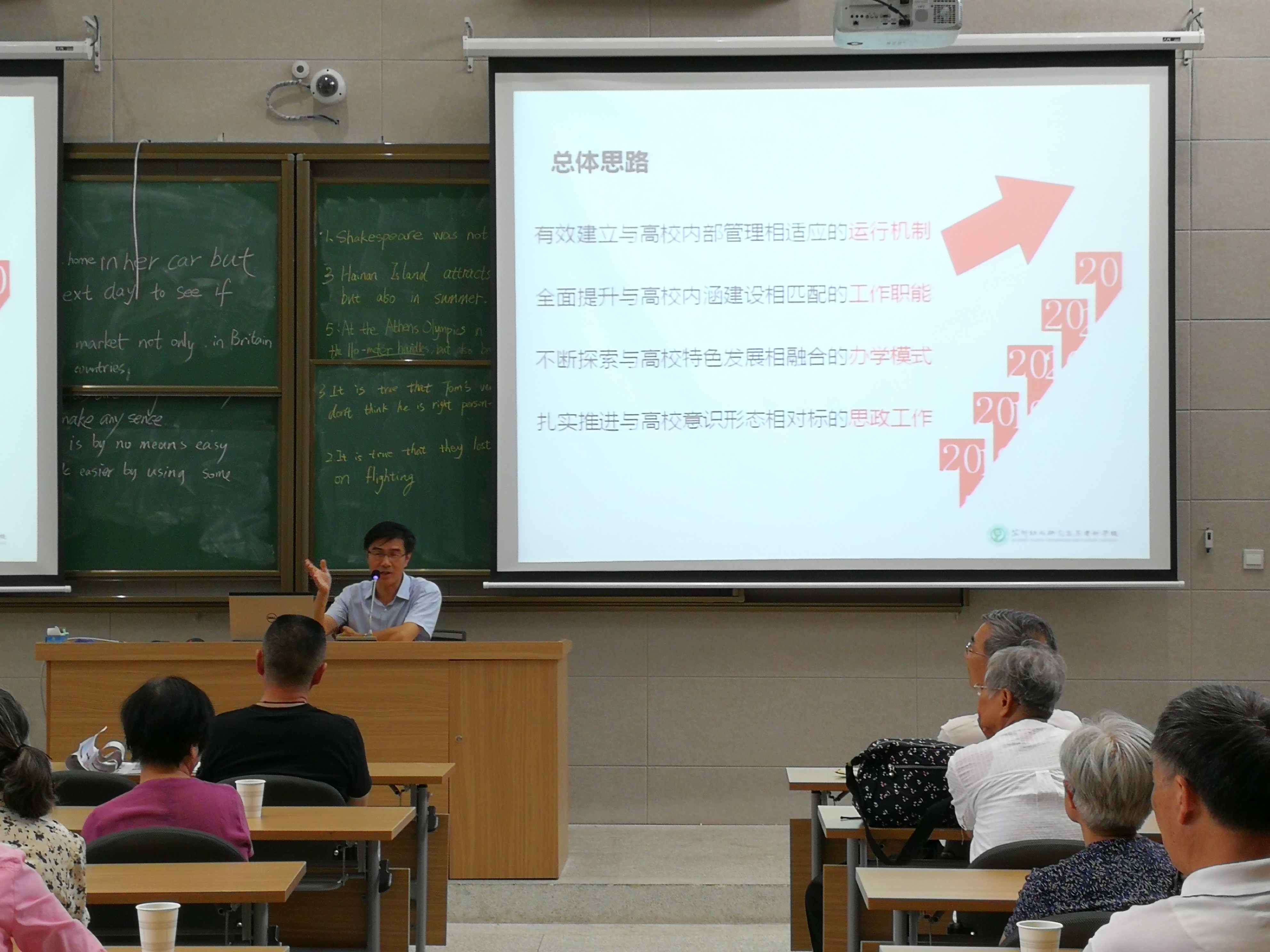 下午1点30分,在合班教室D,退休教师们聆听了杨建良校长作的题为《奋进新时代 开启新征程——高质量办好学前教师教育》的工作总结,杨校长向退休教师们传达了学校转型为高校后的总体工作思路:有效建立与高校内部管理相适应的运行机制、全面提升与高校内涵建设相匹配的工作职能、不断探索与高校特色发展相融合的办学模式、扎实推进与高校意识形态相对标的思政工作。同时,杨校长还从学校基本情况、制度建设、干部聘任、专业论证、示范高校、教育督导等多项内容,向退休老教们介绍了学校一年来取得的成绩。杨校长还叮嘱老教师们要保重身体,常回学校走走看看。