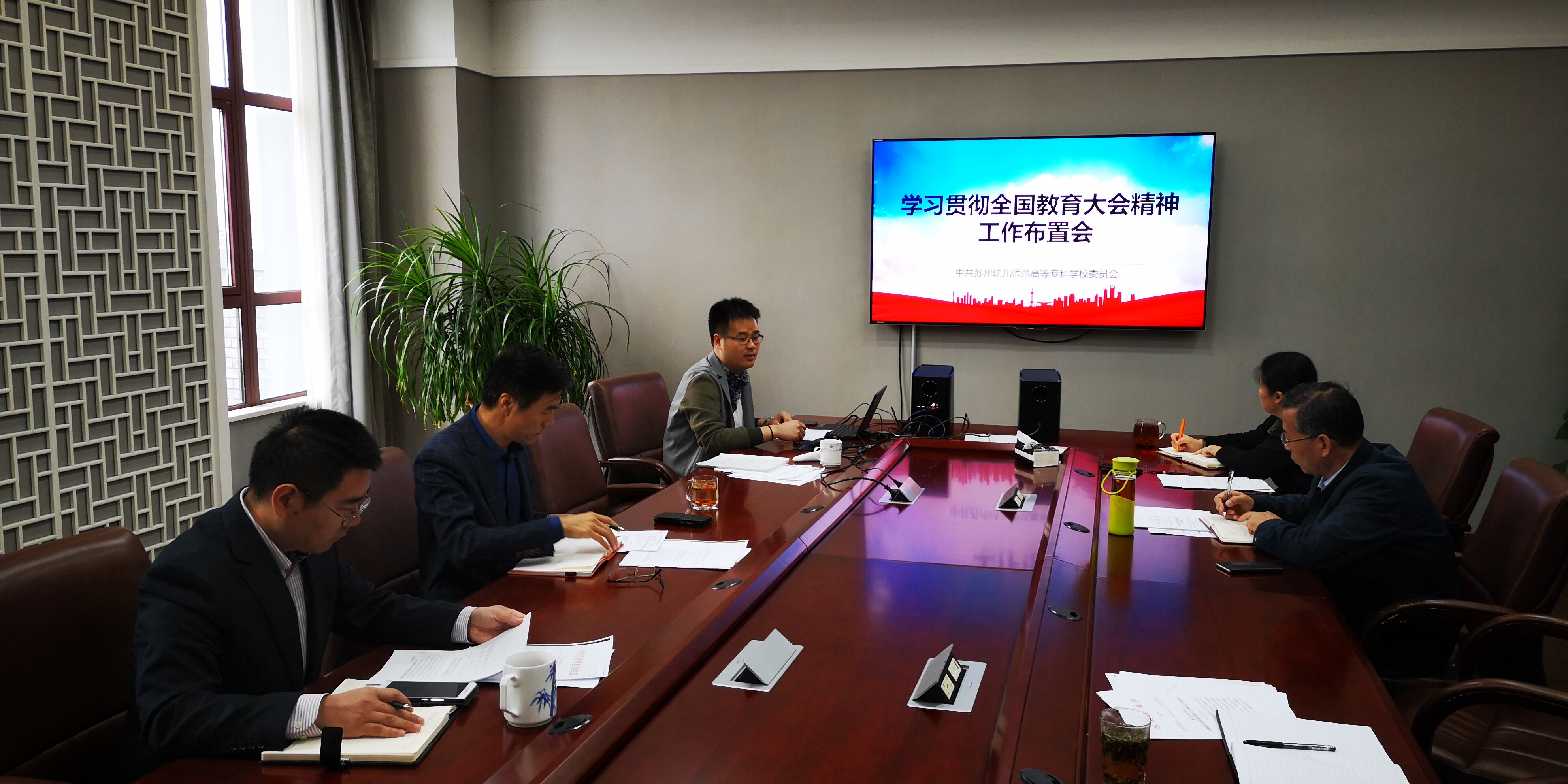 会议首先由杨建良校长传达了《省委教育工委省教育厅关于认真学习贯彻全国教育大会精神的通知》(苏委教﹝2018〕11号)精神。接着,组织人事处副处长潘伟斌带领大家一同学习全国教育大会精神,从前言导读、全国教育大会基本情况、习近平总书记讲话要点、李克强总理讲话要点、全国教育大会20大金句和学习贯彻大会精神等六个部分展开讲解、学习。