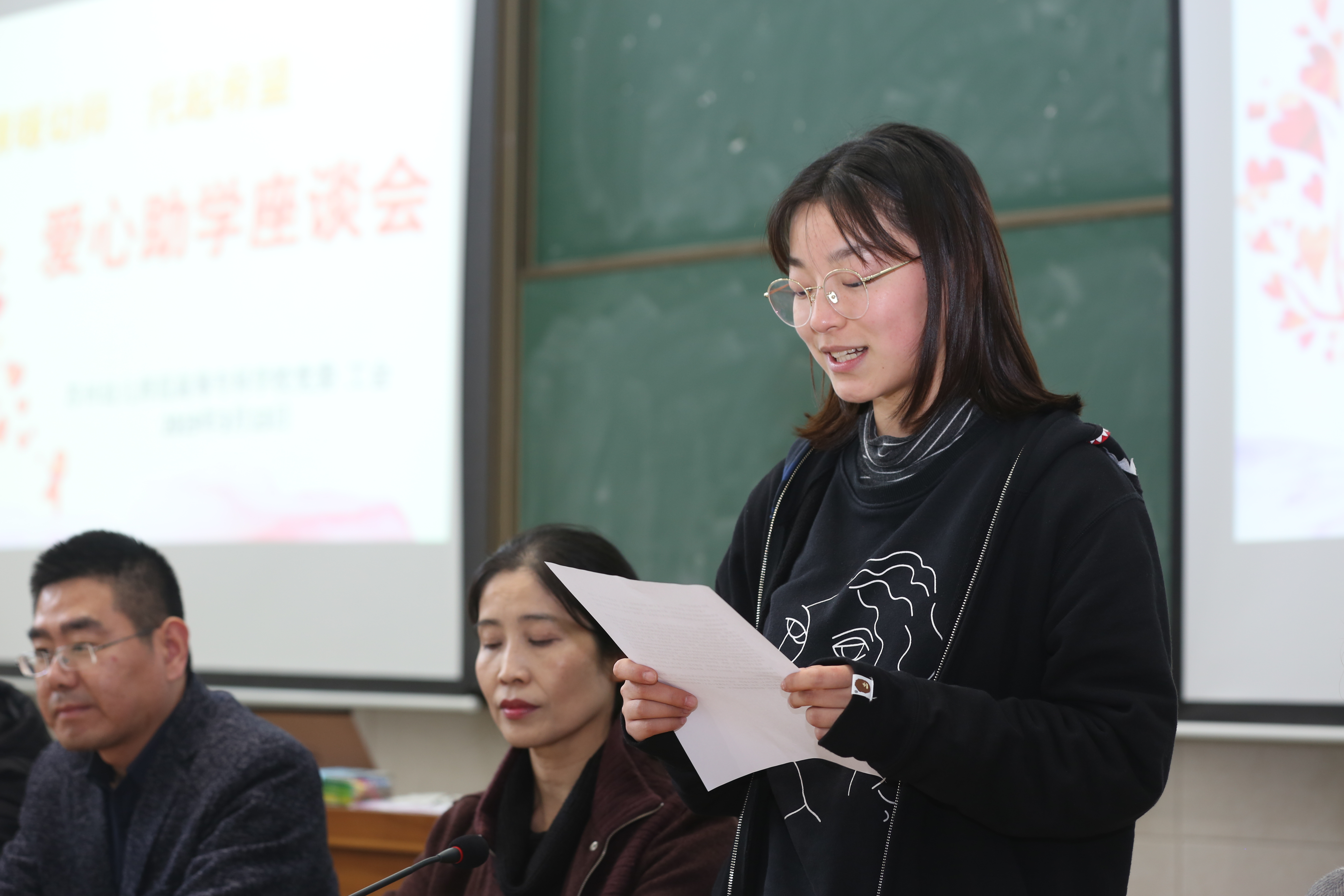 本次会议首先在工会主席王婉青主持下进行简短的捐赠仪式。各个捐助代表或个人向指定的受助同学赠送爱心捐款和学习用品。然后,受助学生代表和捐助教师代表分别发言,她们或从学生角度向各位老师交流近期的学习生活状况,或从教师角度表达对受助学生的关心和爱护。最后,陶华山副校长做总结发言,他与在座的各位师生分享自己的求学经历,鼓励受助同学自立自强,并对他们提出殷切的希望,希望各位同学能用心学习,早日成才,传递爱心,回报社会。