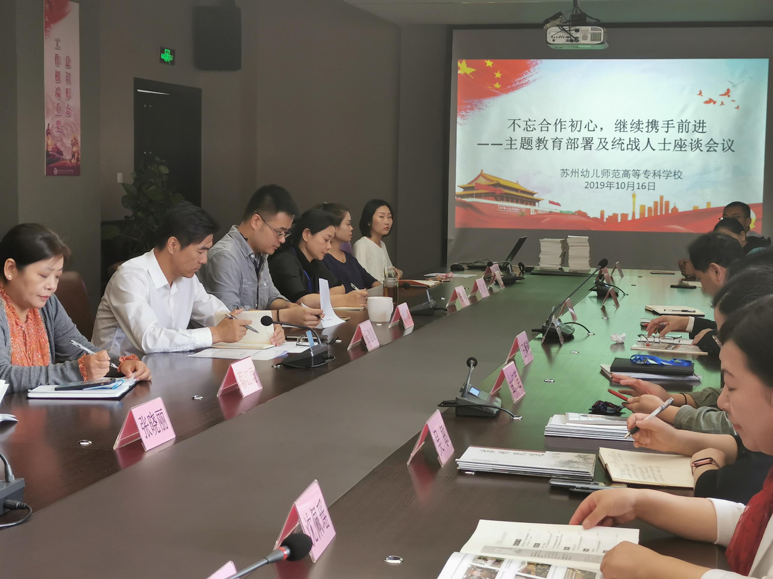 最后,杨建良校长向参会人员介绍了学校《“不忘初心、牢记使命”主题教育》的相关工作,并向统战人士作了“不忘合作初心,继续携手前进”主题教育动员。他指出,希望统战人士要与优秀共产党员能共同成为优秀教师代表,共同承担苏州幼专发展的责任,为建设更高规格、更高层次的苏州幼专多做贡献。