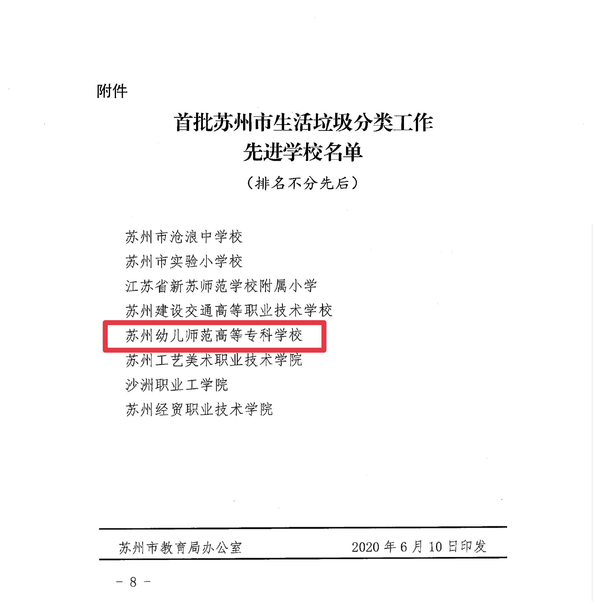 近日,苏州市教育局印发通知,我校荣获首批苏州市生活垃圾分类工作先进学校!