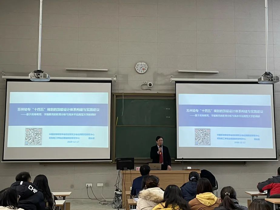 顾教授以《苏州幼专“十四·五”规划的顶层设计体系构建与实践建议——基于高等教育、学前教育的形势分析与高水平应用型大学的调研》为题,从高等教育、学前教育两个角度,为我们全面系统的梳理了我国新时代高等教育发展形势的新表现与新时期学前教育发展的新形势与新要求。
