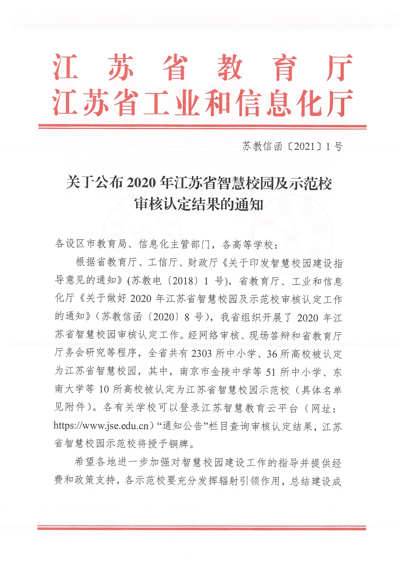 近日,江苏省教育厅、江苏省工业和信息化厅联合印发《关于公布2020年江苏省智慧校园及示范校审核认定结果的通知》(苏教信函〔2021〕1号),我校被认定为2020年江苏省智慧校园!