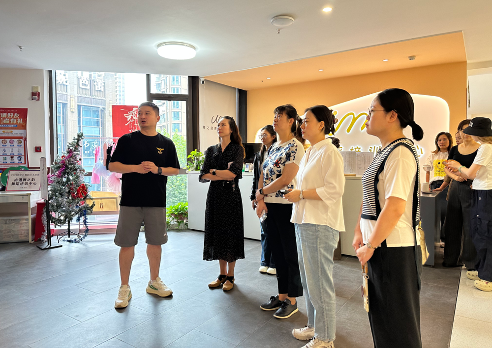 当天上午,调研组在中心负责人郁总的陪同下,参观了舞之韵舞蹈培训中心的各类舞蹈教室、排练厅及辅助功能室等硬件设施,详细了解了其课程体系、教学特色、师资配置与日常运营管理模式。作为南通地区具有较高知名度和影响力的艺术教育机构,舞之韵在少儿及青少年舞蹈教育领域积累了丰富经验,形成了较为成熟的教学体系。