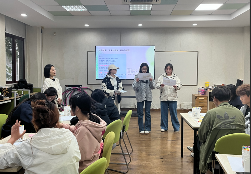 在核心的“人生时间轴・石头与鲜花” 生命故事分享环节,施英博士引导同学们绘制年龄时间轴,用暗色笔标注3个“人生石头”,写下成长中的困难与阻碍,并标注“这段经历磨练了我……”;再用亮色笔绘制 3 朵“人生鲜花”,记录高光时刻并标注 “我靠____获得了这份美好”。在倾诉与倾听中,同学们梳理人生经历,学会在冲突中管理情绪、在合作受挫时保持韧性,从每一次关系互动中汲取成长养分,有效提升心理调适与自我成长能力。