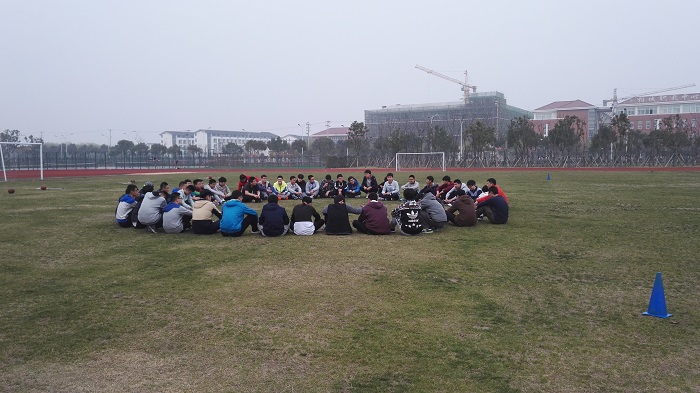 在所有组都到达终点后,班主任刘如强老师让所有同学围成一个圆圈,与同学们席地而坐,总结这一次游戏活动的结果。在热闹和谐的氛围中,刘老师向大家提出一个问题:每组为什么能够将篮球顺利的运输到终点呢?刘如强老师首先让获胜组306宿舍的代表进行经验总结,组员代表认为:他们的小组能够快速且顺利的完成,是因为他们听从了组长的指挥和安排,同时组员之间的合作与协调也是很重要原因。