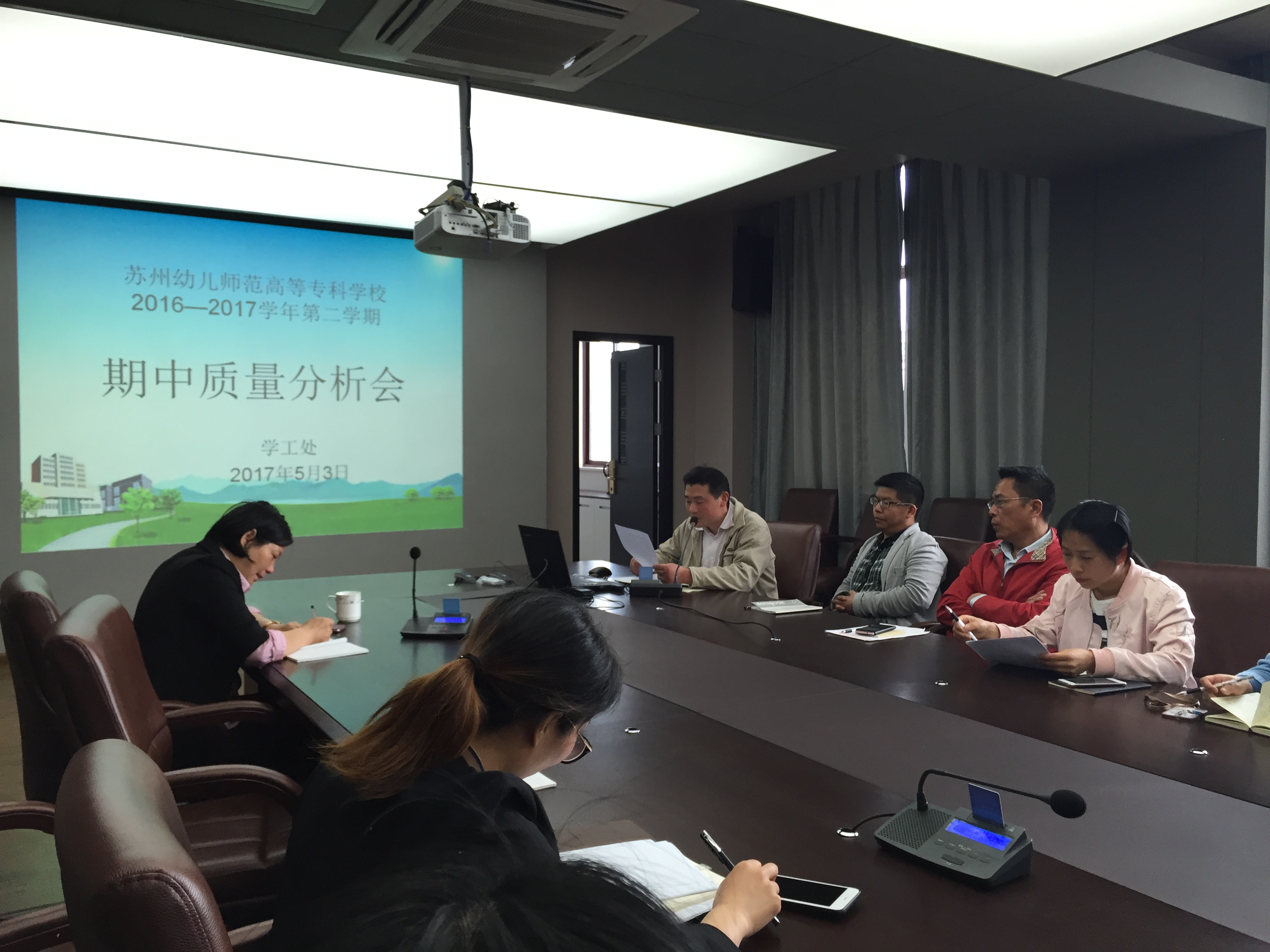 为更好的了解学生的学习状态、思想动态,帮助班主任老师更全面掌握班级学生状况,加强年级组之间的交流学习,5月3日下午我校召开了2016—2017第二学期期中质量分析会。本次会议由学工处肖蕾主任主持,全体班主任和各系学工干部参加。