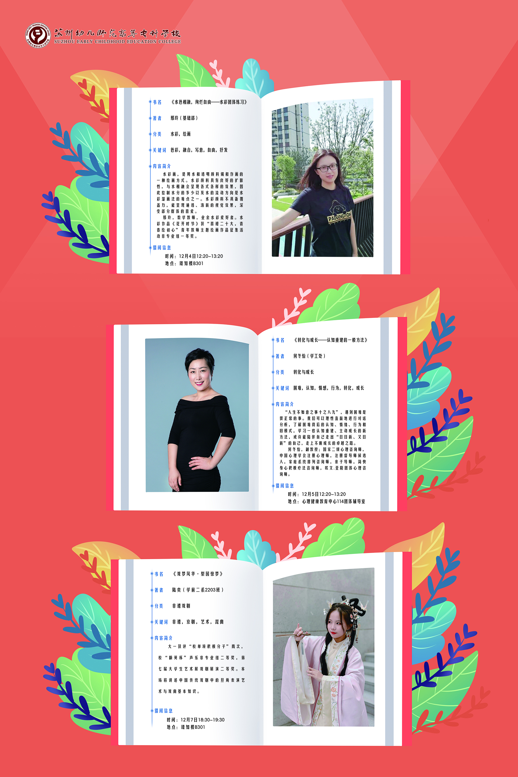 截至目前,图书馆已征集到“真人图书”计13“册”,主题内容涵盖职业发展与个人成长、专转本经验交流、心理健康、时间管理、形象管理、社会实践、艺术鉴赏、班干部自我成长、教师资格证考试备考、技能课学习经验分享等;“真人图书”将于11-12月在校内进行线下交流;自本周起,每周开展2-3“册”图书的借阅活动;请同学们密切关注图书馆公众号与PU平台获知具体借阅的时间、地点及人数。