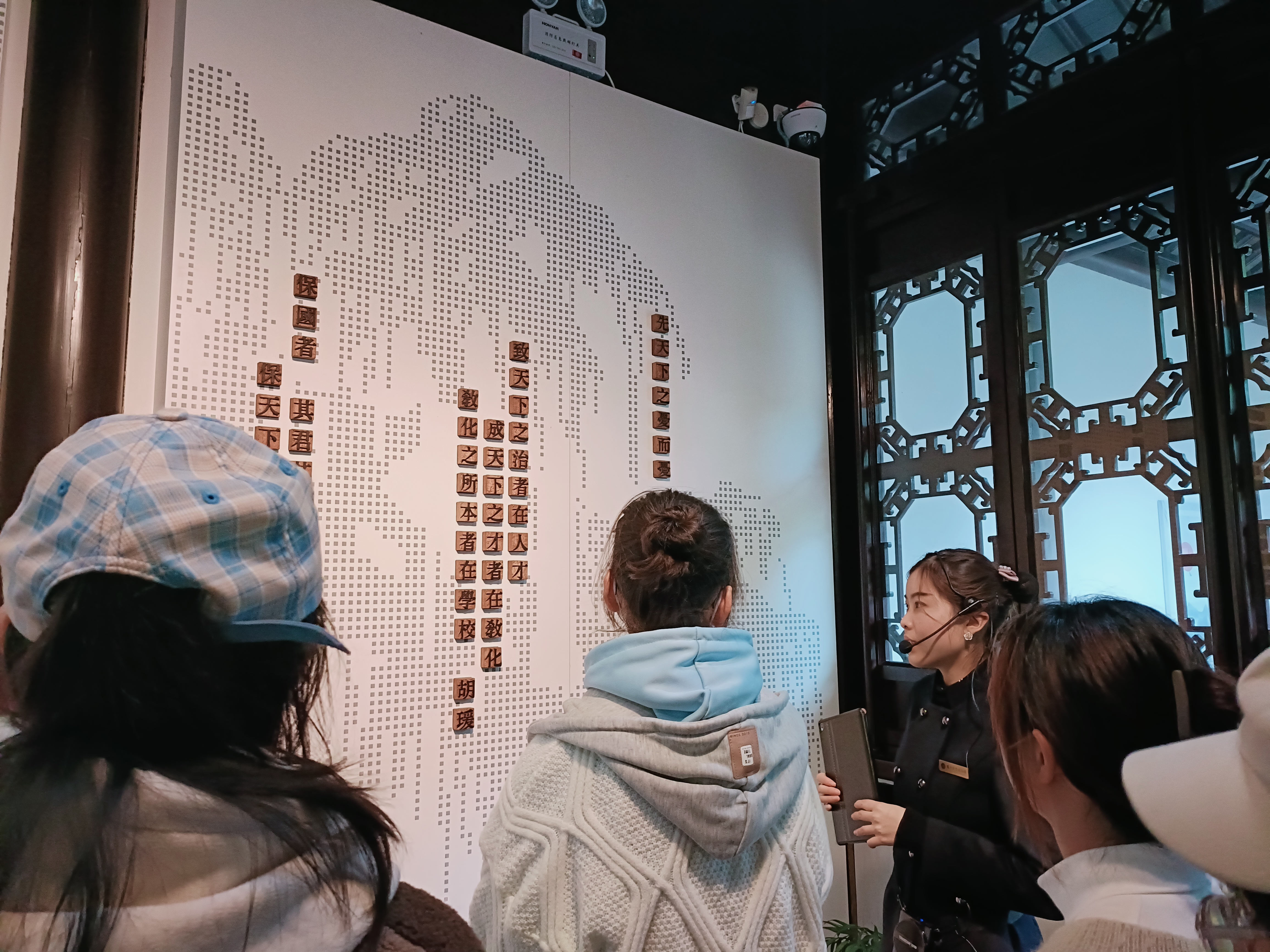 之后,大家进入馆内了解古代人才的选拔制度以及古人读书方式。通过画轴和影像,还原当时场景。鸳鸯厅内呈现南方北圆的建筑特点,与“阴阳互运,和谐共生”理念相呼应。听取了对苏州的四大书院如和靖书院,鹤山书院、紫阳书院、正谊书院以及其历任山长的介绍。在私塾模拟场景中,以动画的形式,生动地还原了当时学子读书场景。