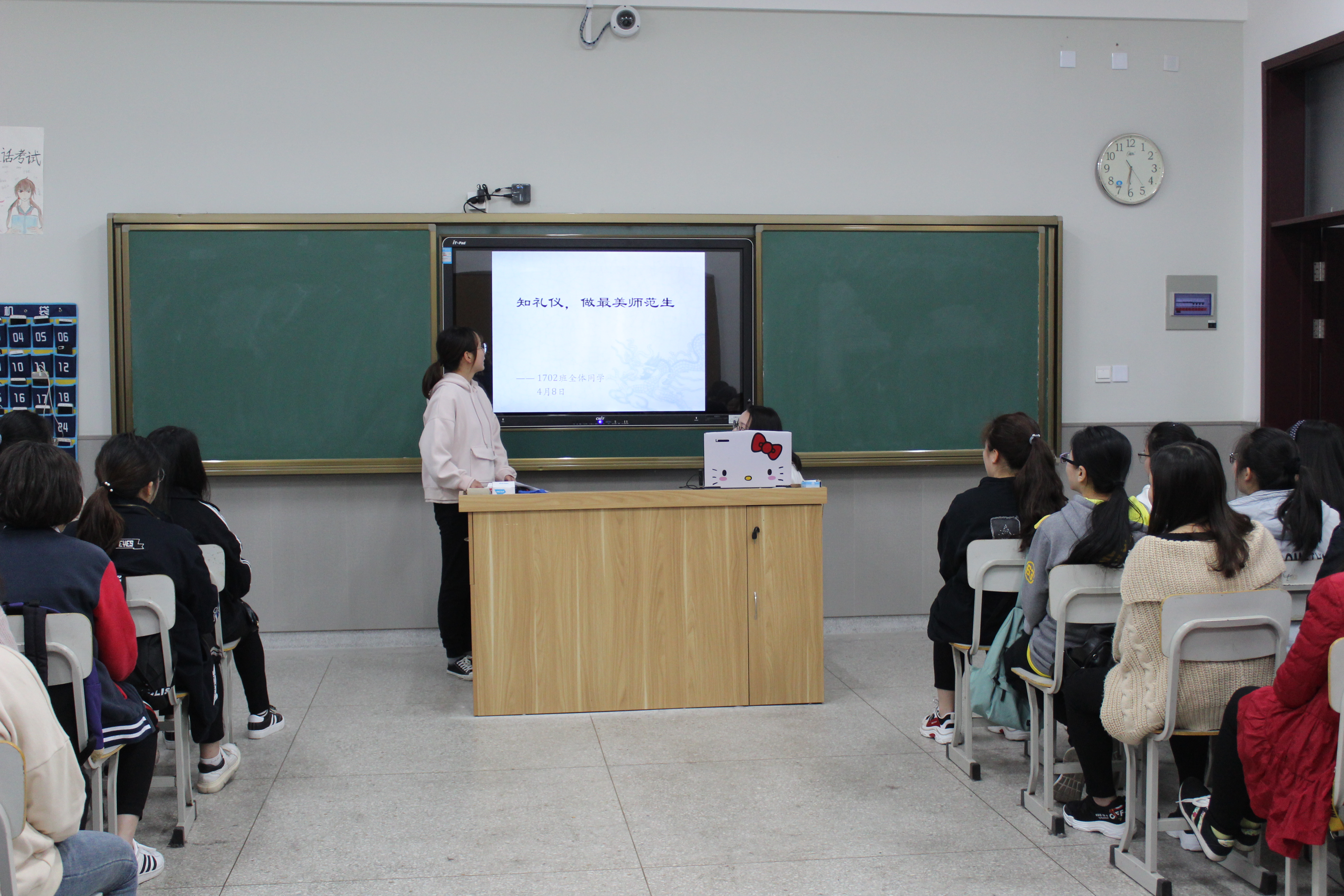 2018年4月8日,二系172班举行了“知礼仪,做最美师范生”的仪容仪表教育班会。蒋朝群老师、倪莹老师、16、17级的班委代表出席了本次班会。