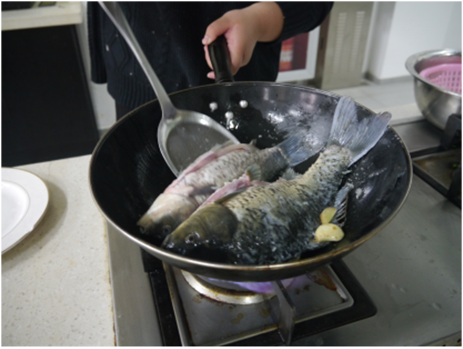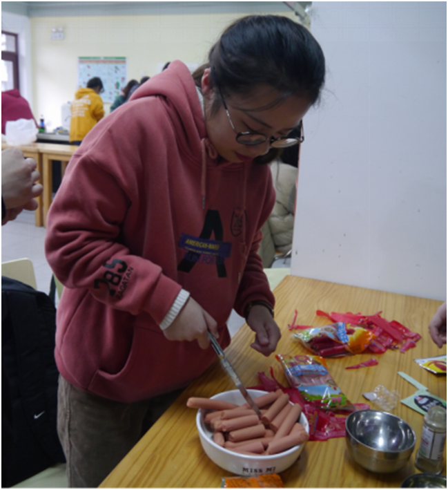 美好的生活总是离不开食物诱人香甜的味道,同学们分工明确地在屋子里忙碌着。长桌上,有人切着芹菜,有人拌着肉馅,有人调着酱料,做着食材的清洗准备工作。灶台前,同学将食材倒入锅中,逐一加入佐料,认真翻炒,等待美食的出锅。