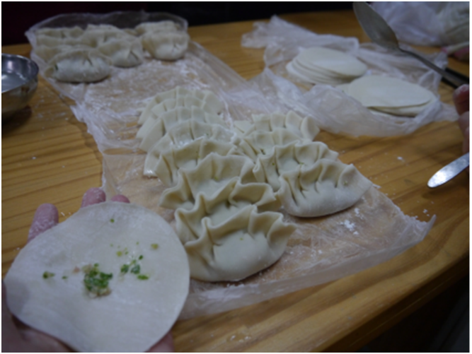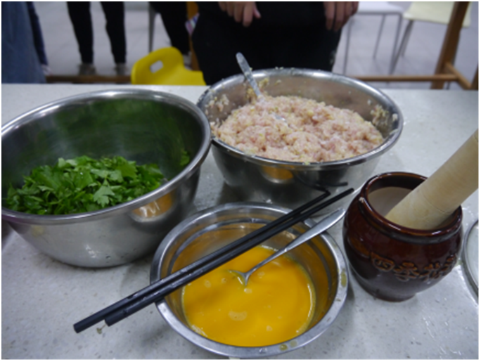 活动前,由几位同学前往大润发买来了新鲜的食材,有新鲜猪肉,白菜,胡萝卜,洋葱,芹菜,番茄,鸡蛋,饺子皮等,还有做菜必不可少的油盐酱醋等佐料。