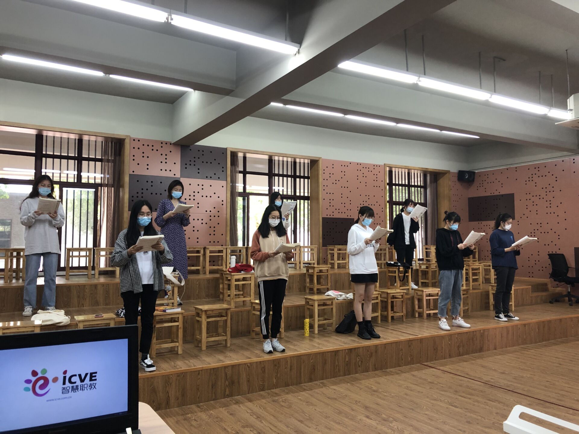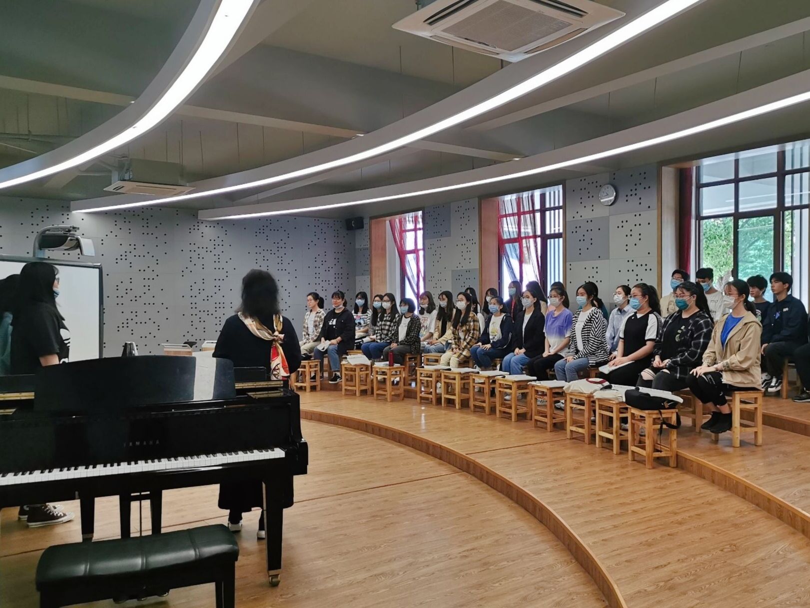 声乐课、舞蹈课、钢琴课、书法课等技能课也如常进行。课堂上老师们认真负责,例如舞蹈课上老师会进行示范,讲解细节手势与步伐,依次给同学纠正动作,确保大家的舞姿优美统一。声乐老师带领大家一遍遍地演唱歌曲,让同学们放开嗓音大胆的唱出来。硬笔书法课的老师会认真板书,一笔一划地讲述字体的结构,如何控制运笔的轻重缓急,在同学们练字的过程中时刻提醒大家保持良好的坐姿和运用正确的握笔方式,让我们全身心的投入其中。体育课也多以舒缓运动为主,比如做八段锦运动,柔和缓慢,动静相兼。