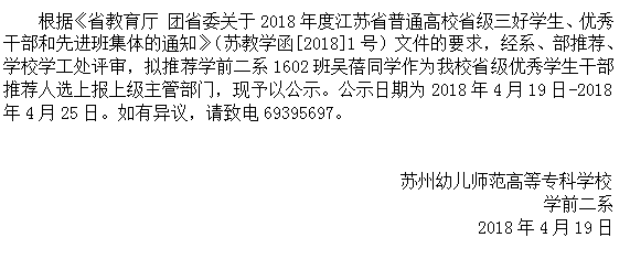 关于2018年江苏省优秀学生干部拟推荐人选公示