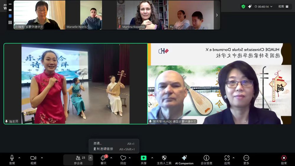 文化交流,心心相连。2025年10月,我校举办“乐承古今 诗越重洋”中华文化出海行德国专场线上音乐会,华德学校组织师生齐聚“云端”欣赏;2026年农历新年,我校附属幼儿园师生录制拜年视频,在德国华校的马年春节联欢会上播放,跨越山海传递真挚祝福。