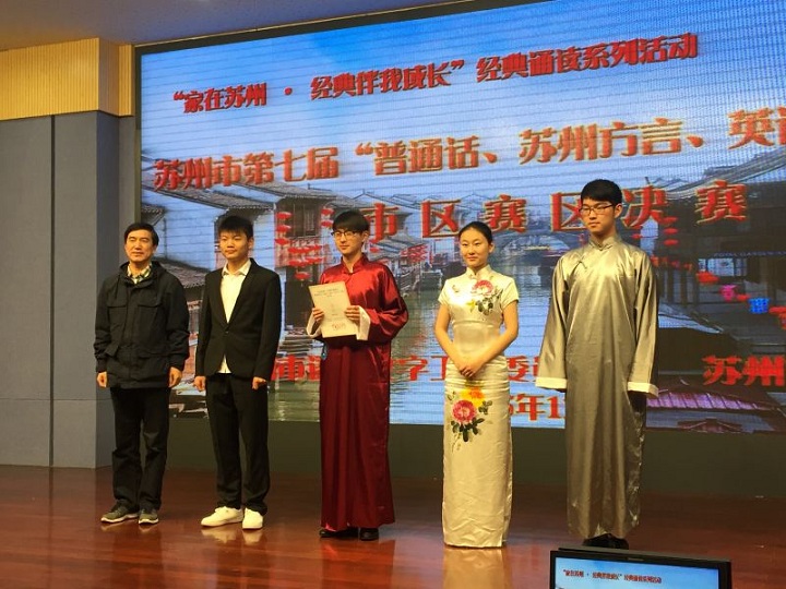 11月21日,我校朱君谊、王阅、陆宇舟、刘天雷四位同学在嵇红英老师和张涵韵老师的带领下,在市教师发展中心参加苏州市第七届“普通话、苏州话、英语口语”比赛,获得团体一等奖和个人一等奖的好成绩。
