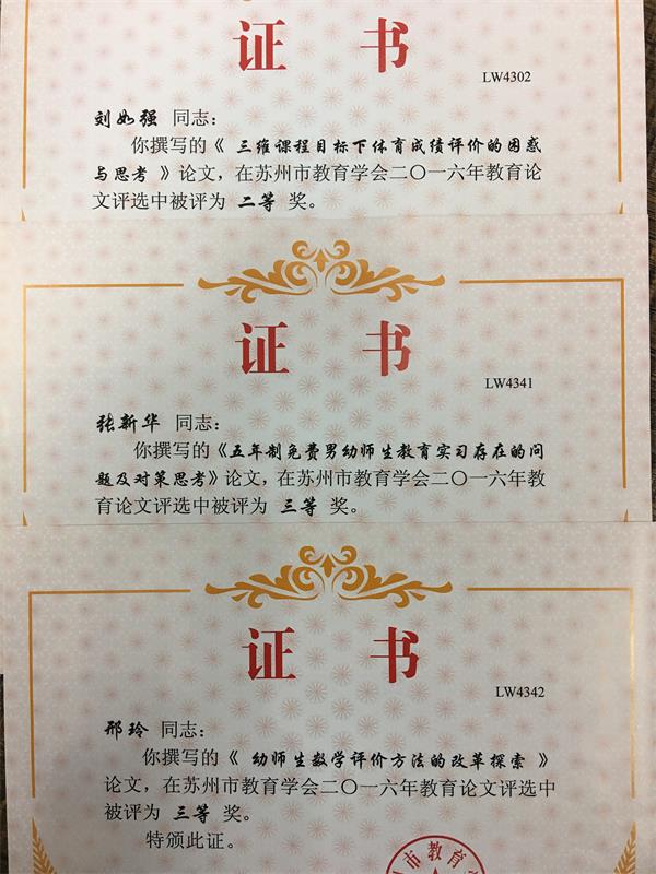 我校三位教师在市教育学会论文评比中获奖 时间:2017-01-09 12:23:18 来源:科研处 作者:科研处 浏览:次 分享到: 我校刘如强老师的论文《三位课程目标下体育成绩评价的困惑与思考》在苏州市教育学会2016年教育论文评选比赛中荣获二等奖,张新华老师的《五年制免费男幼师生教育实习存在的问题及对策思考》和邢玲老师的《幼师生数学评价方法的改革探索》在此次评选中荣获三等奖。 打印正文 关闭本页