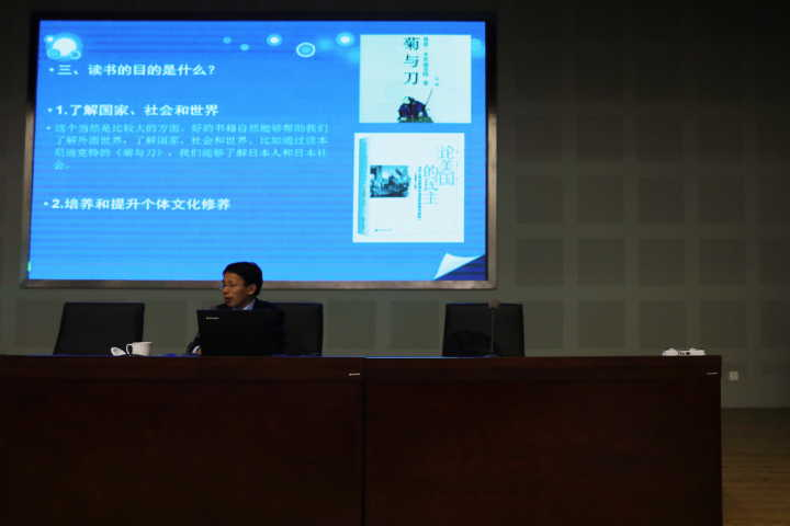 曾教授结合身边的事例和网络热点事件,从媒介的改变对阅读方式和效果的影响谈起,兼及人类生活方式的巨变,讨论了新媒体时代的人文阅读的现状,从正反两面谈新媒体时代较之于纸媒时代的人文阅读的利弊得失,梳理了当代大学生的阅读现状,既有乐观的估计,也有悲观的担忧。之后,曾教授结合个人读书、教书经历,与同学们分享了读书的目的、进行人文阅读的方法,推荐了《乡土中国》《剑桥中华人民共和国史》《旧制度与大变革》《城市文化》《传统的发明》等书籍,并建议同学们多阅读,多参加人文系列讲座和沙龙活动,提升自己的人文修养。最后,曾教授现场回答了两位同学关于人文阅读和人文修养的提问,寄语同学们读自己的书,赏自己的月,给自己多一点反思和欣赏的时间和空间。