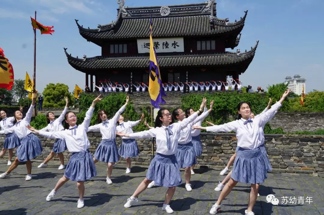 第二站,快闪活动来到了具有文化底蕴和水城特色的盘门景区。师生们在“水陆萦回”的古城墙上,摩挲历史的厚重,歌唱亲爱的祖国;船行在护城河上,感受在传承中行进的城市风貌,舞动青春的朝气。