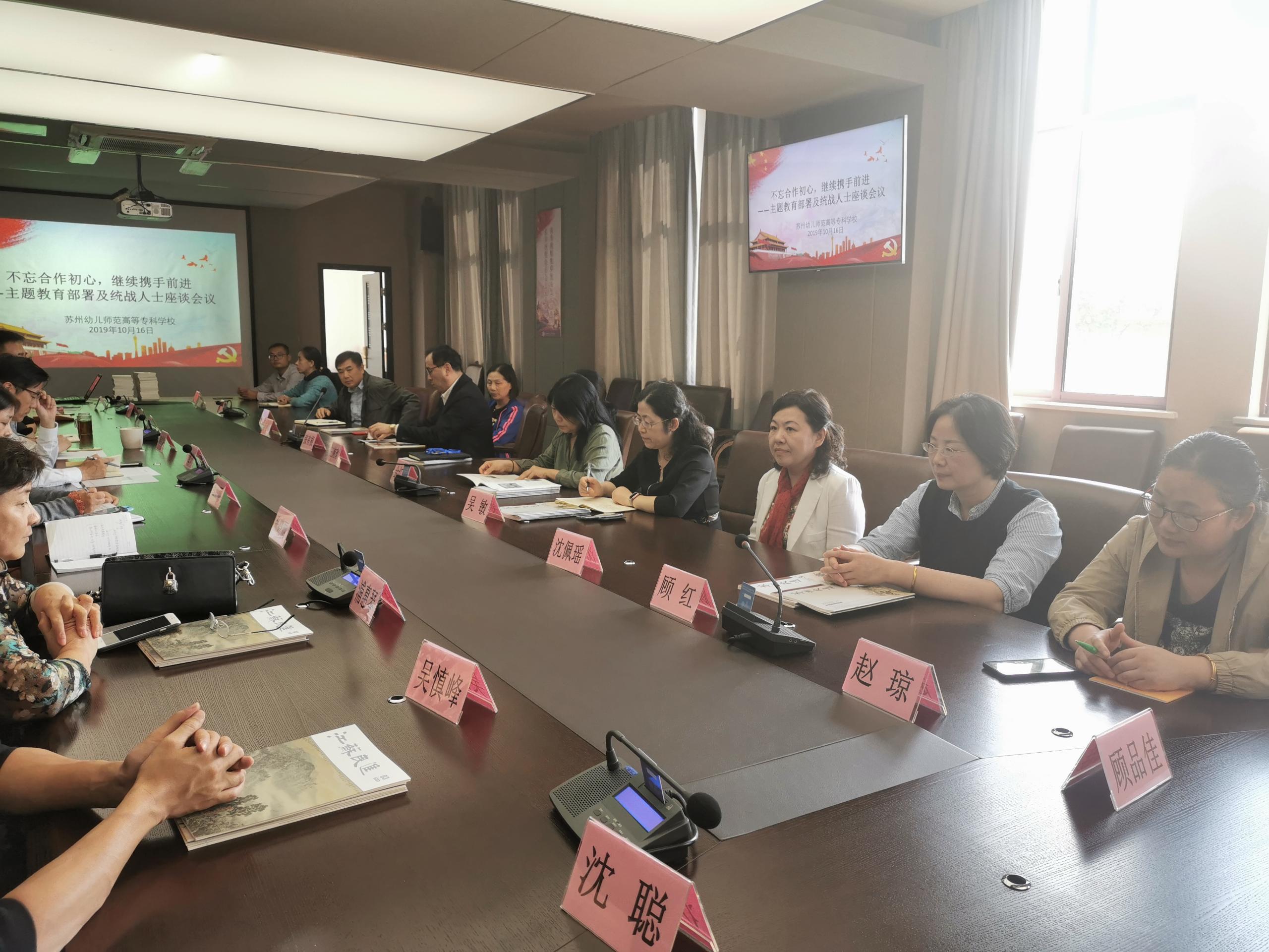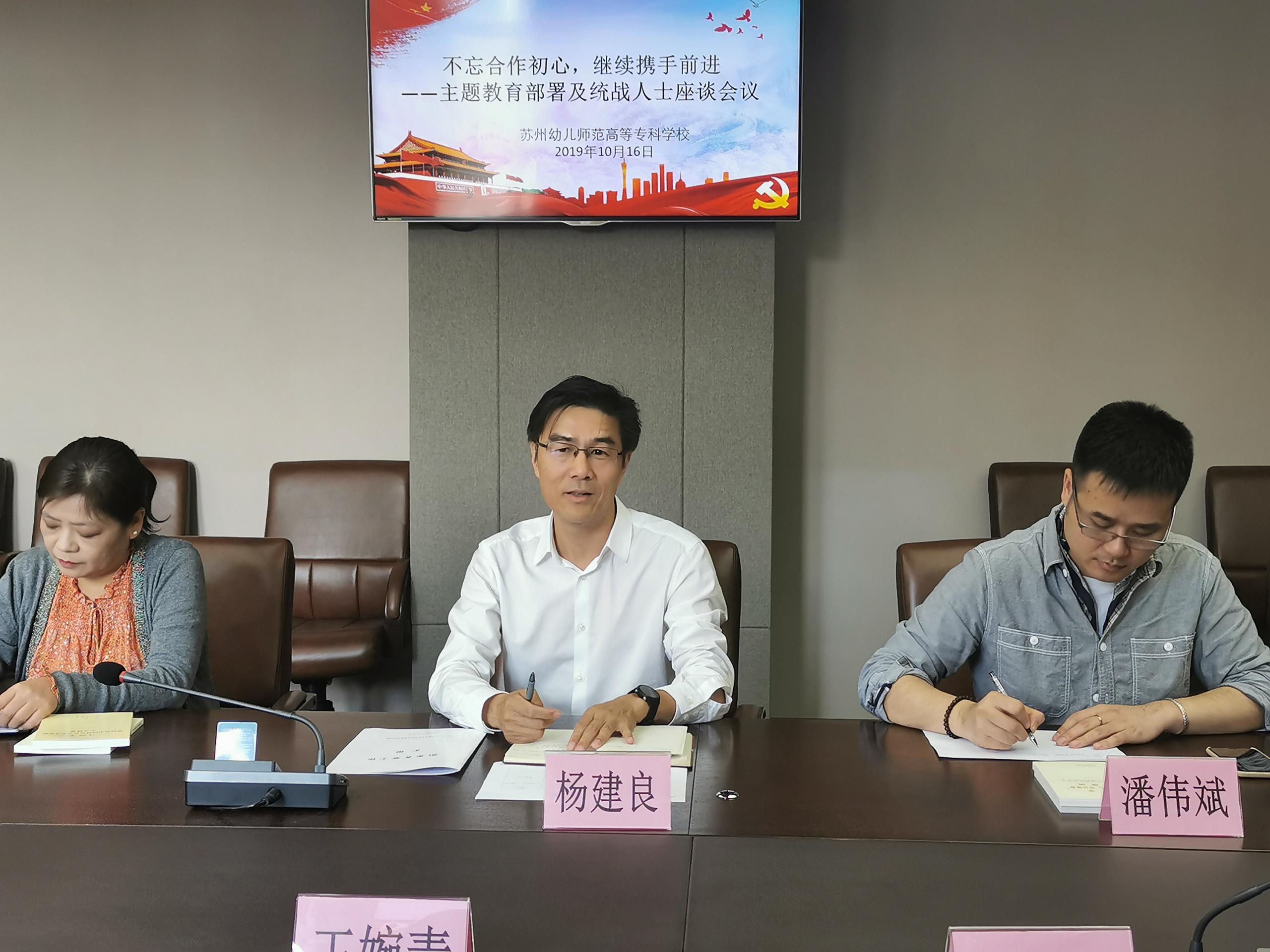 最后,杨建良校长向参会人员介绍了学校《“不忘初心、牢记使命”主题教育》的相关工作,并向统战人士作了“不忘合作初心,继续携手前进”主题教育动员。他指出,希望统战人士要与优秀共产党员能共同成为优秀教师代表,共同承担苏州幼专发展的责任,为建设更高规格、更高层次的苏州幼专多做贡献。