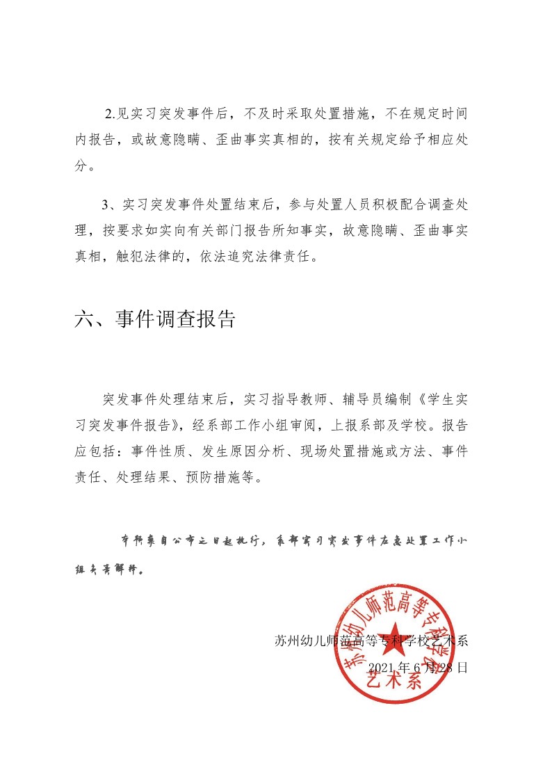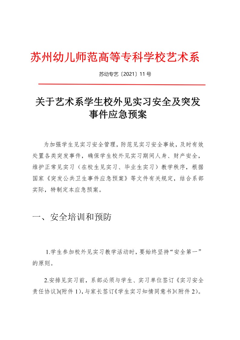 苏幼专艺【2021】11号艺术系学生校外见实习安全及突发事件应急预案 来源:本站原创 发布时间:2021-07-07 12:36:15 浏览次数: 次 【字体:小 大】 附件:1.实习安全责任协议202107071235321849.docx附件:2.学生实习家长知情同意书202107071235476976.docx 分享到: 【打印正文】