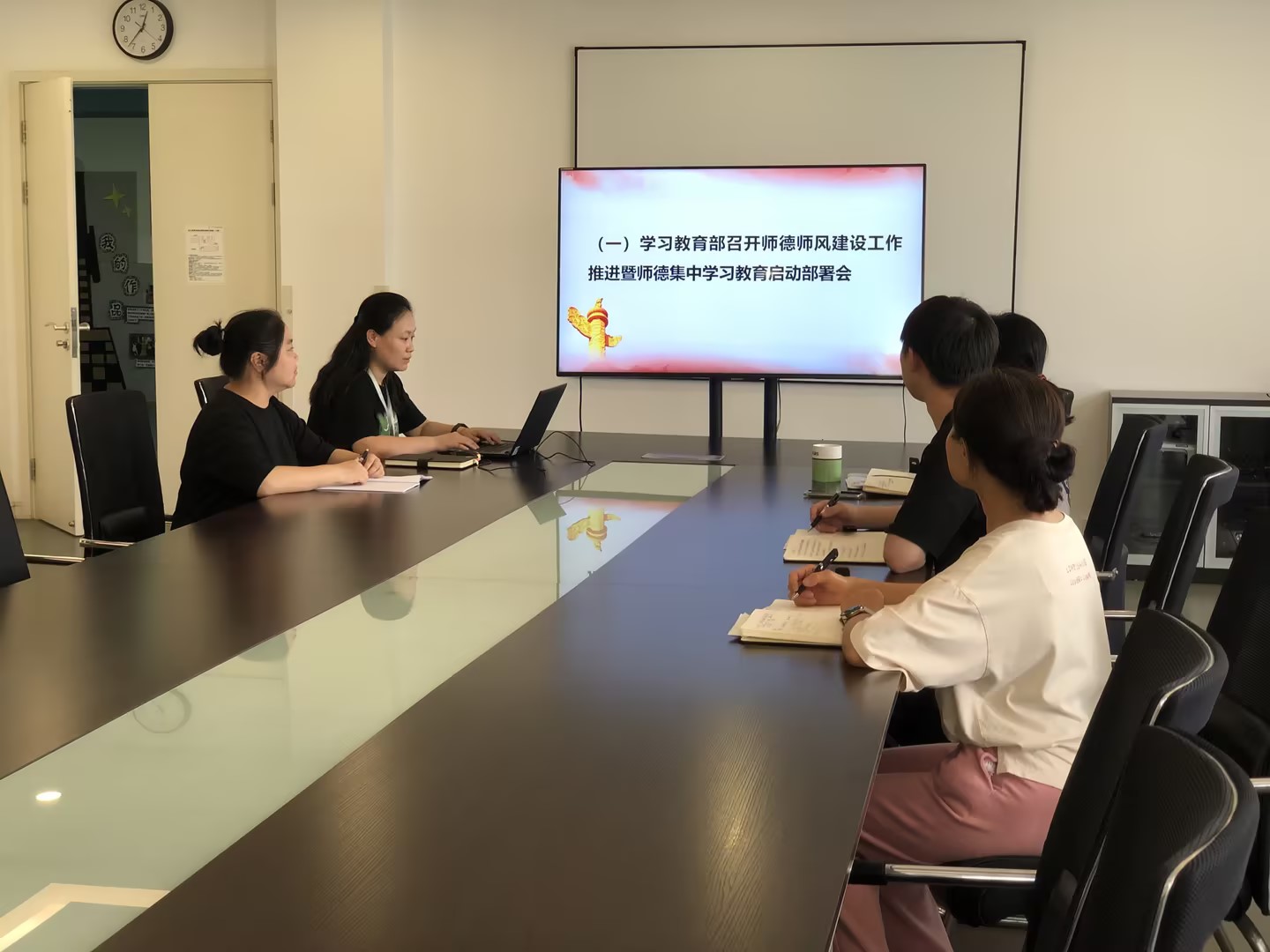 在主题当日活动中,首先在支部书记罗静老师的牵头下,大家一起学习了解了习近平总书记近期重要讲话及相关党内法规等学习资料,以及6月6日教育部召开的师德师风建设工作推进暨师德集中学习教育启动部署会相关会议内容。通过会议纪要的学习,充分认识到教育系统的作风建设特点,决定了党风政风、师德师风、校风学风必须要一体谋划、推进。
