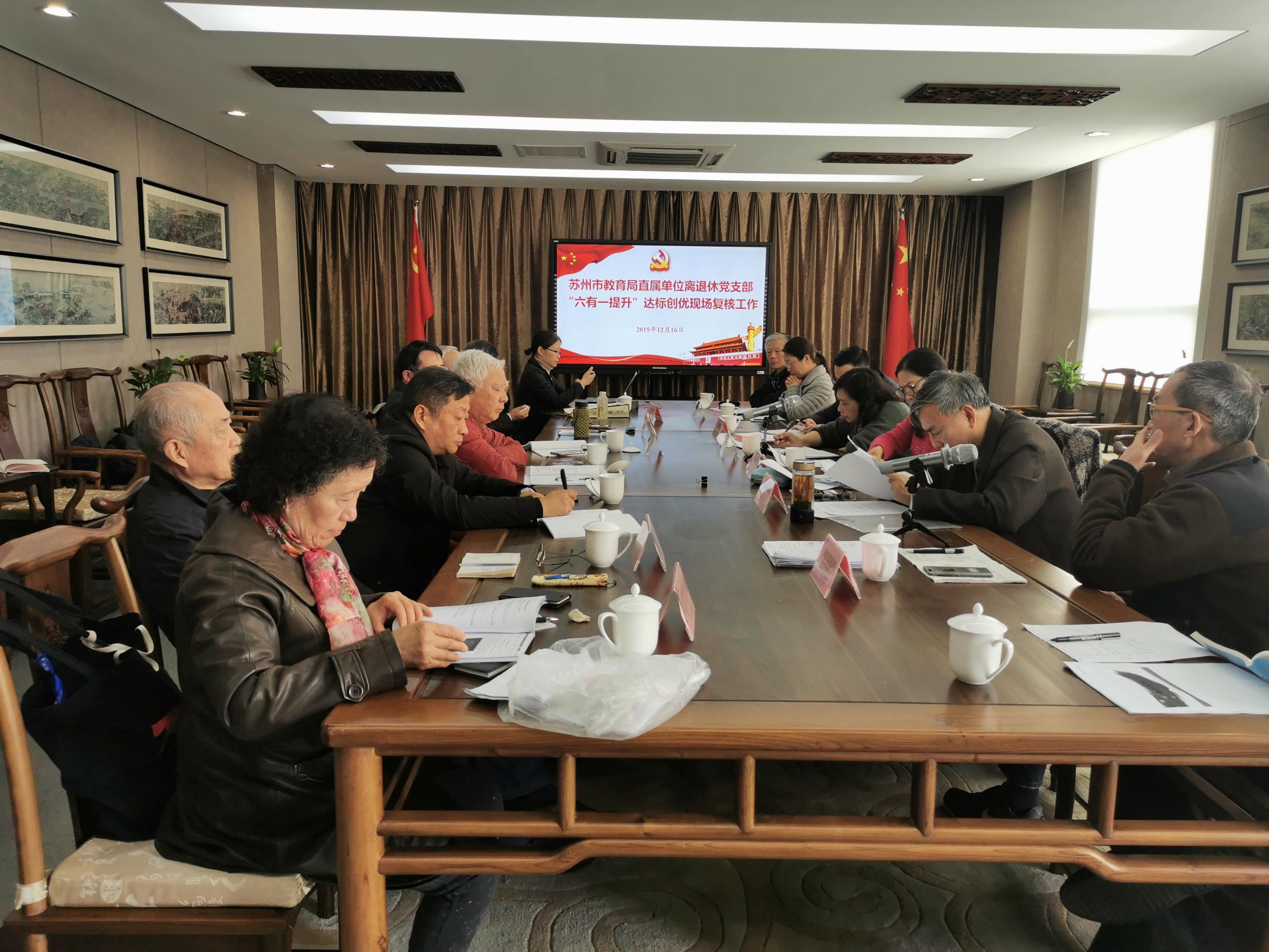2019年12月16日上午,根据《苏州市离退休干部党支部“六有一提升”达标创优实施细则》以及《关于做好离退休干部党支部“六有一提升”达标创优复核工作的通知》(苏教离函〔2019〕4号)文件精神,苏州市教育局直属单位离退休党支部“六有一提升”达标创优现场复核工作在教师发展中心四楼报告厅举行,我校退休支部书记汪乃铭校长、组织人事处张晓丽老师参加了本次会议,会议由市教育局组织处周芸处长主持。