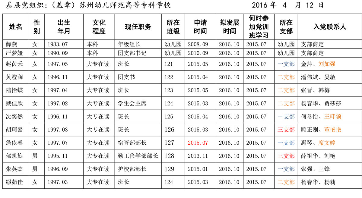2016年计划发展党员花名册 来源:本站原创 发布时间:2016-06-03 17:08:00 浏览次数: 次 【字体:小 大】 附件1:发展工作材料记录注意事项 附件2:发展新党员档案材料检查打分表(20140926) 分享到: 【打印正文】