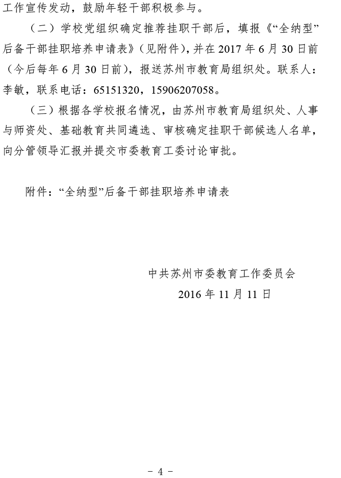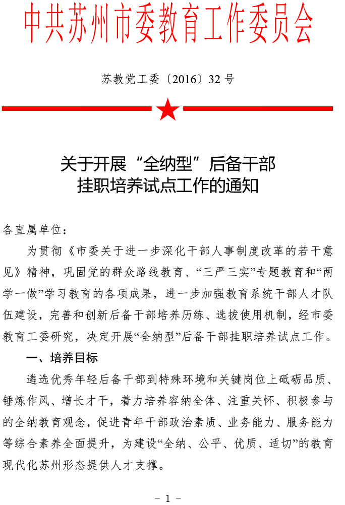 苏教党工委〔2016〕32号-关于开展“全纳型”后备干部挂职培养试点工作的通知 来源:本站原创 发布时间:2016-11-15 14:29:28 浏览次数: 次 【字体:小 大】 附件:苏教党工委〔2016〕32号-关于开展“全纳型”后备干部挂职培养试点工作的通知 分享到: 【打印正文】