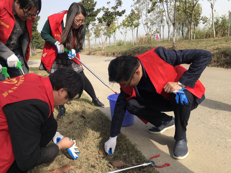 活动的第一项内容是在阳澄湖边志愿活动。学校党员在校党委副书记杨建良的带领下,在阳澄湖边进行巡河,捡拾垃圾。